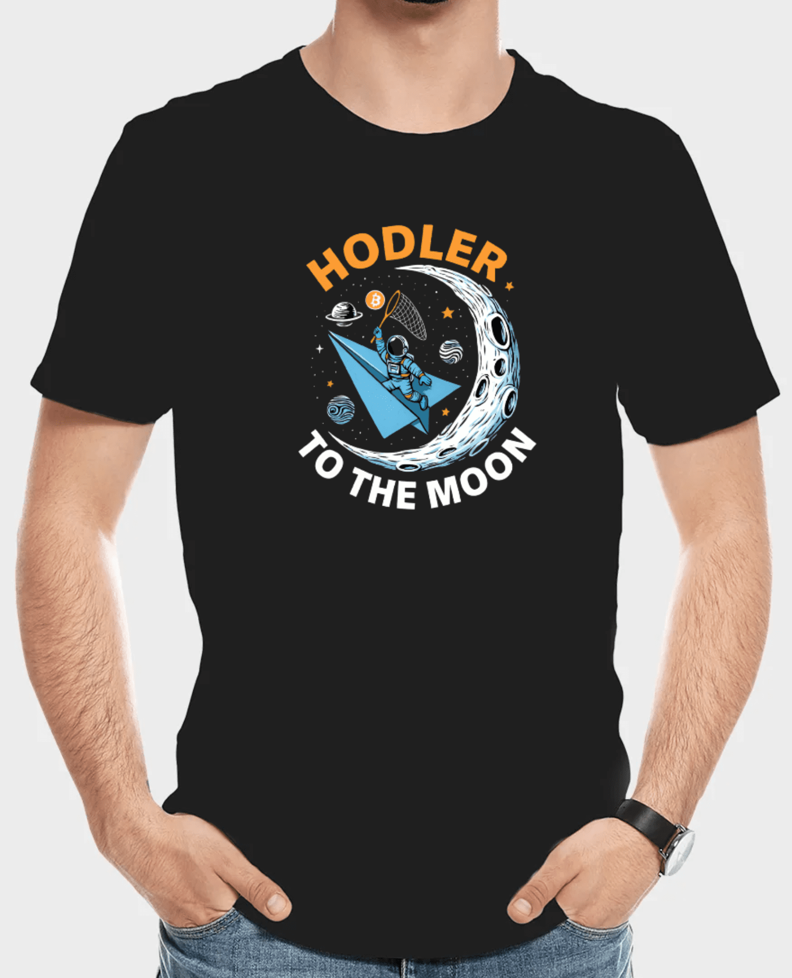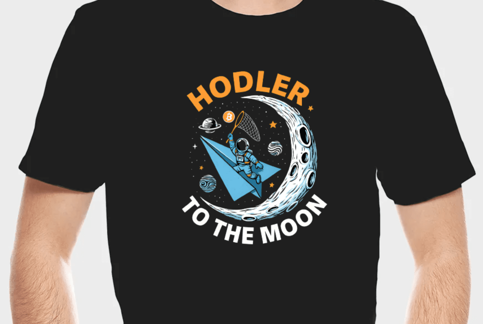 The artwork depicts an astronaut riding a paper airplane through space, holding a net with a Bitcoin symbol inside, aiming toward a large crescent moon.