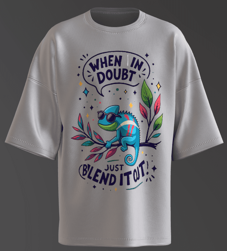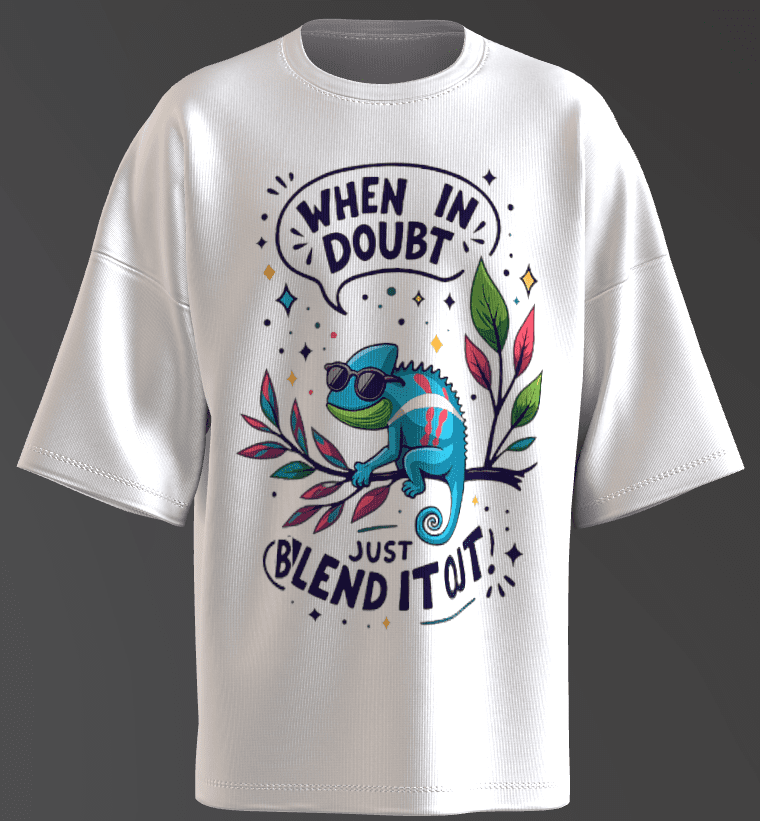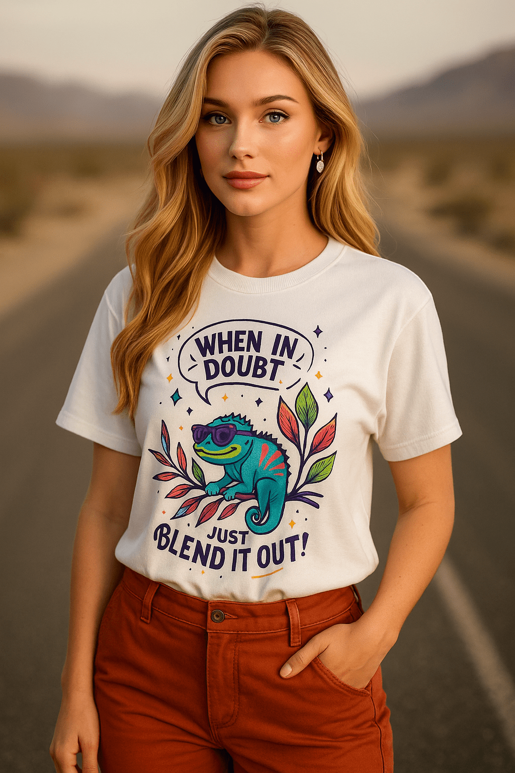 The phrase “When in Doubt, Just Blend It Out” could be a nod to mindfulness or self-acceptance, encouraging viewers to adapt and find peace in uncertain situations—mirroring the chameleon’s survival instinct.