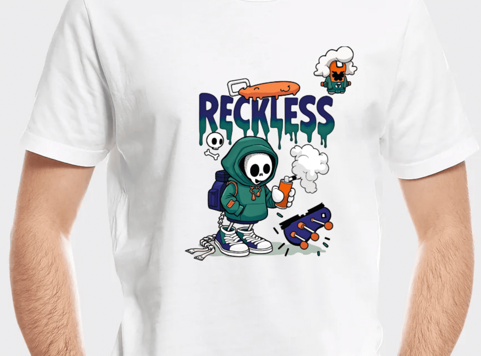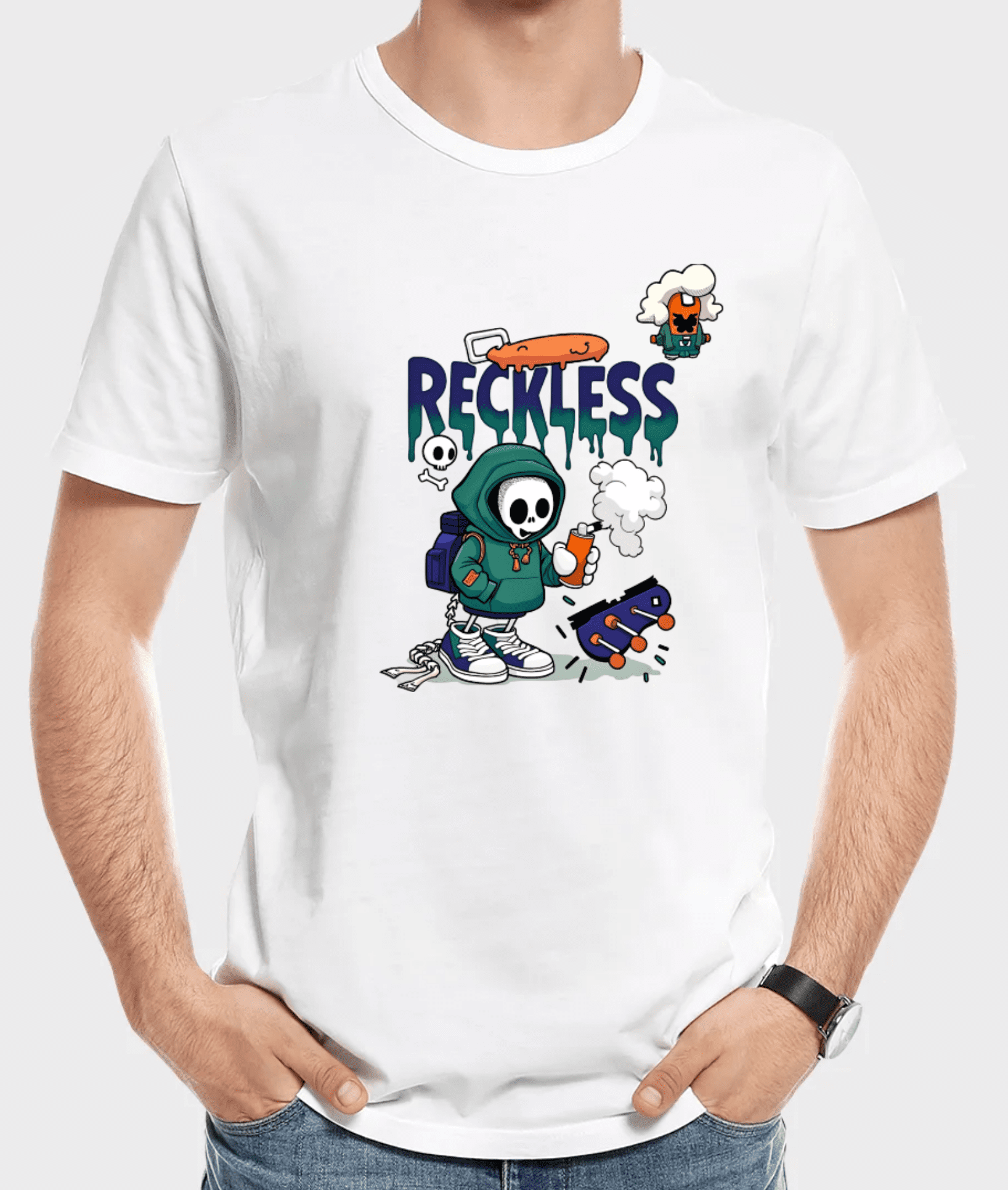 The choice of the word “RECKLESS” reflects the attitude of the skeleton—someone who doesn’t follow rules, takes risks, and lives boldly.