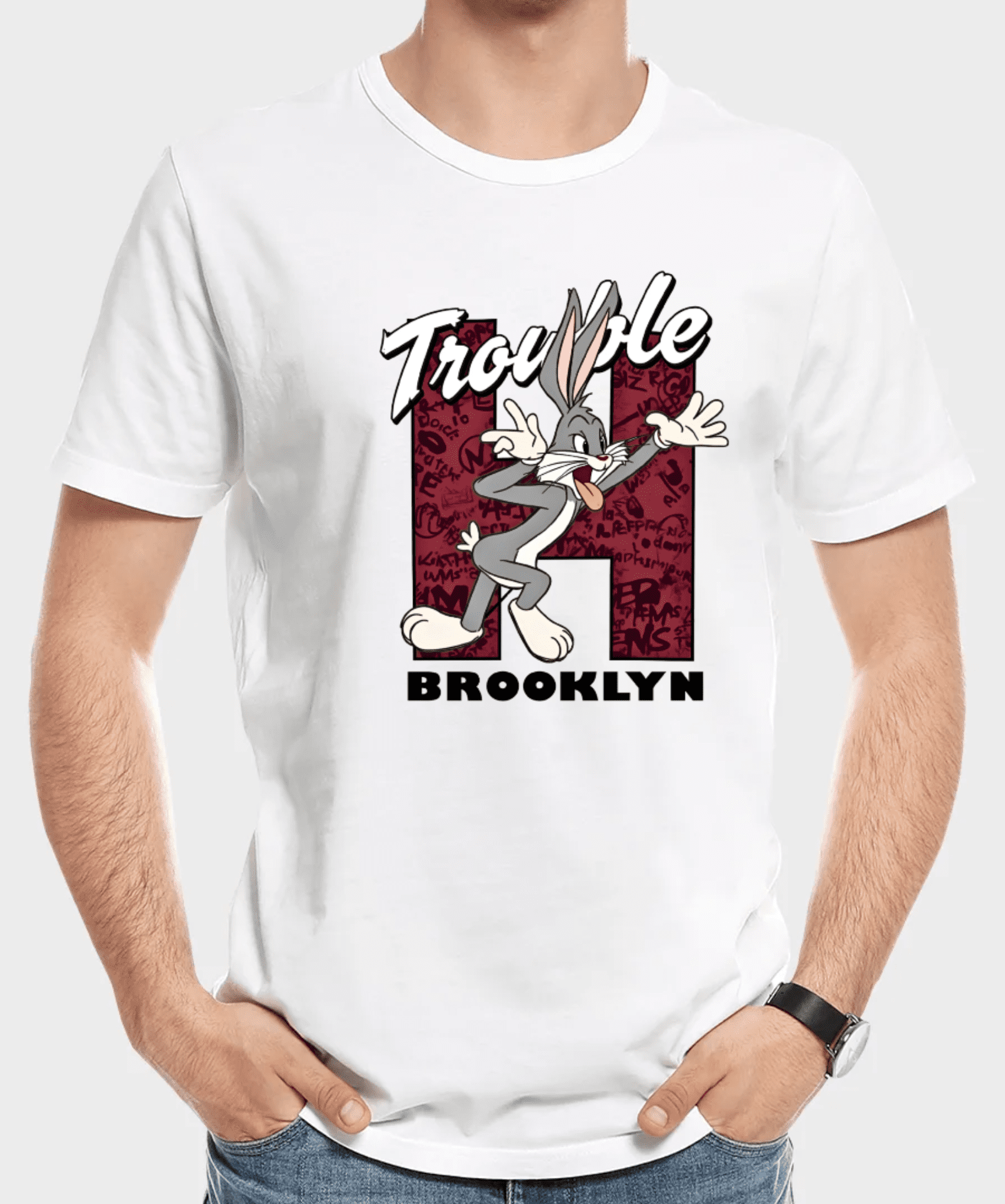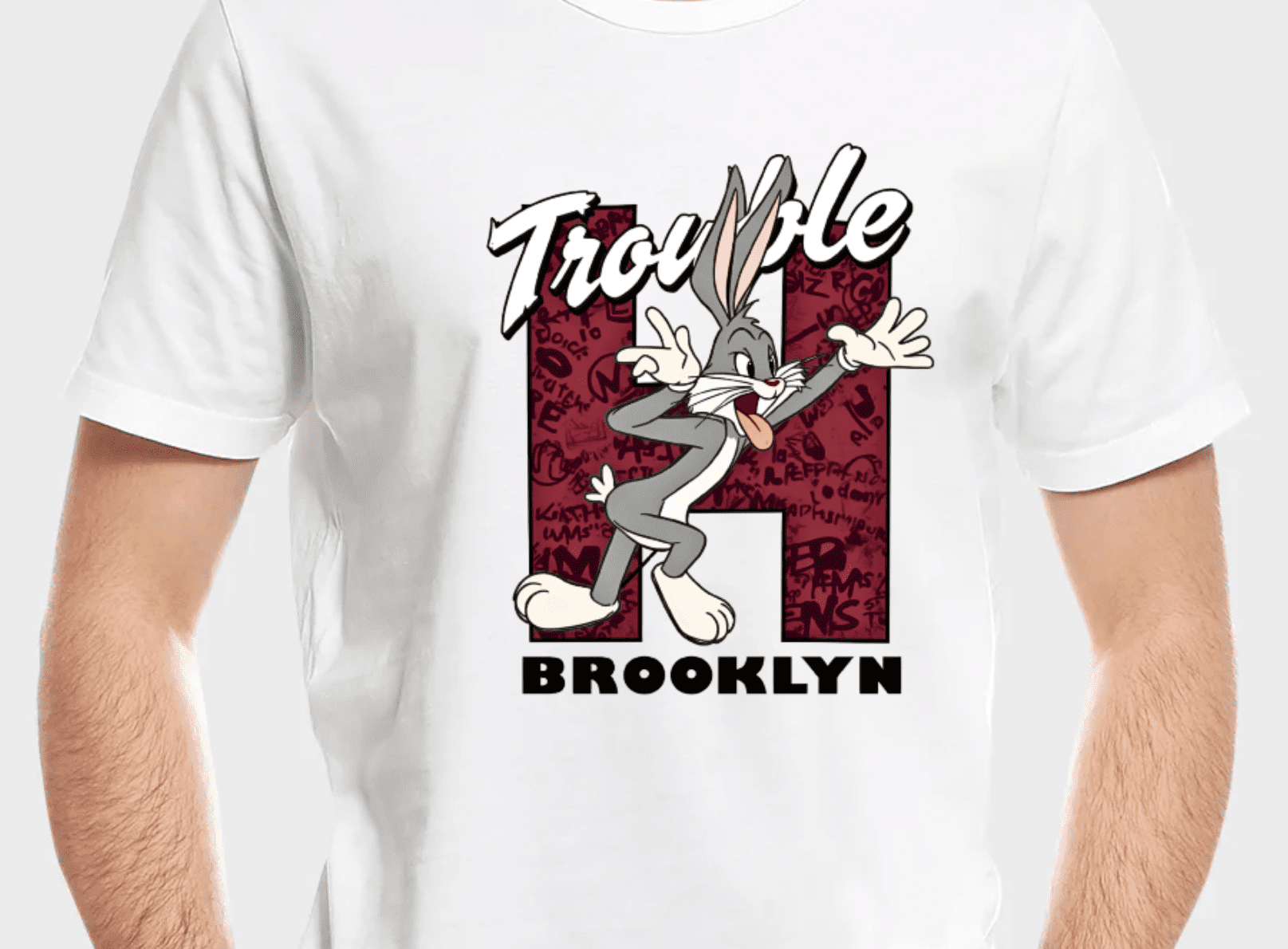 The use of maroon, white, and black creates a striking contrast. Maroon in the “H” reflects the earthy, modern tones of Brooklyn, while the white and black in Bugs and the random text add a timeless, cartoonish flair.