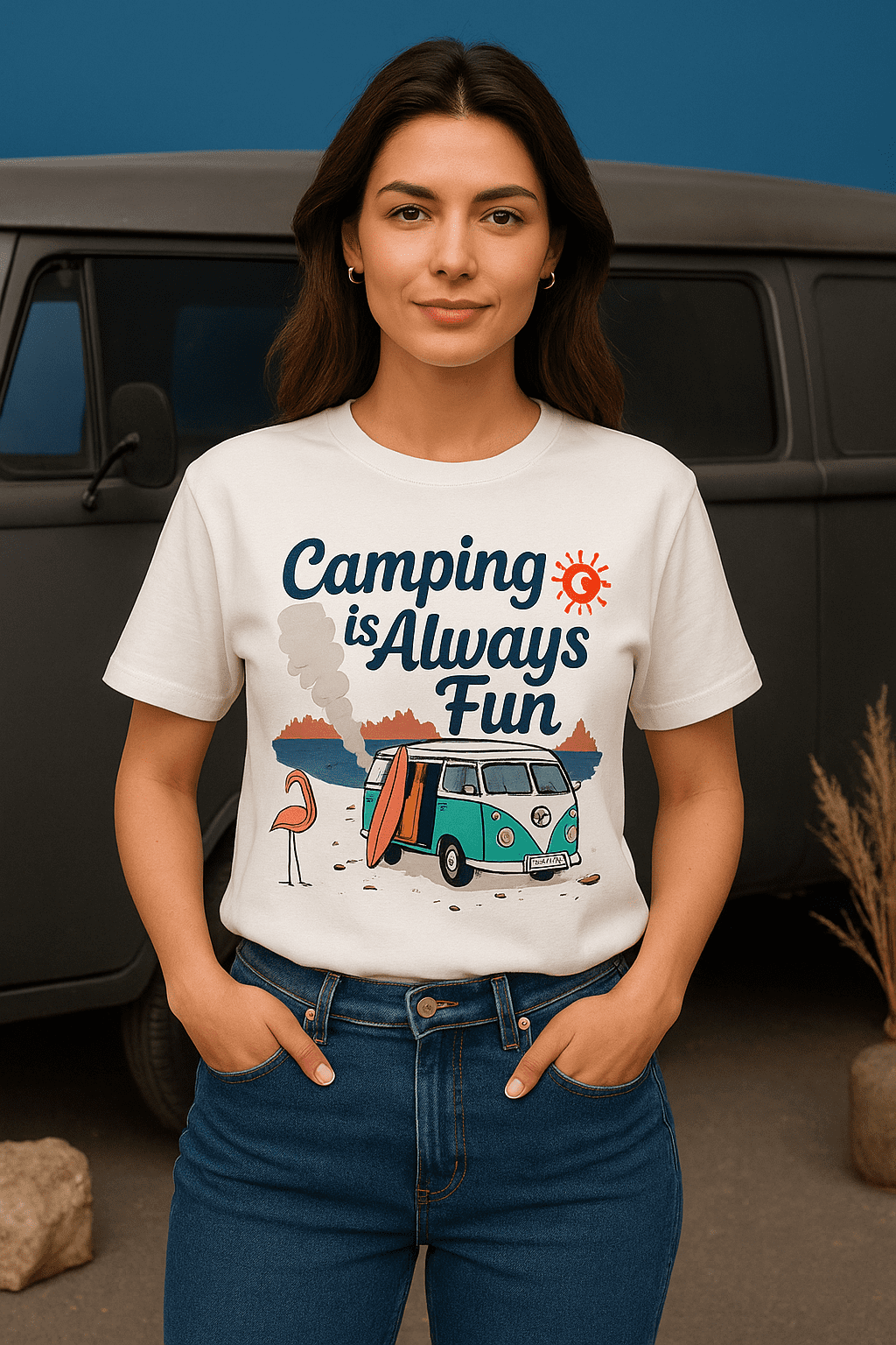 The inclusion of a surfboard nods to coastal beach culture, blending it with the camping theme to evoke a sense of freedom and exploration.