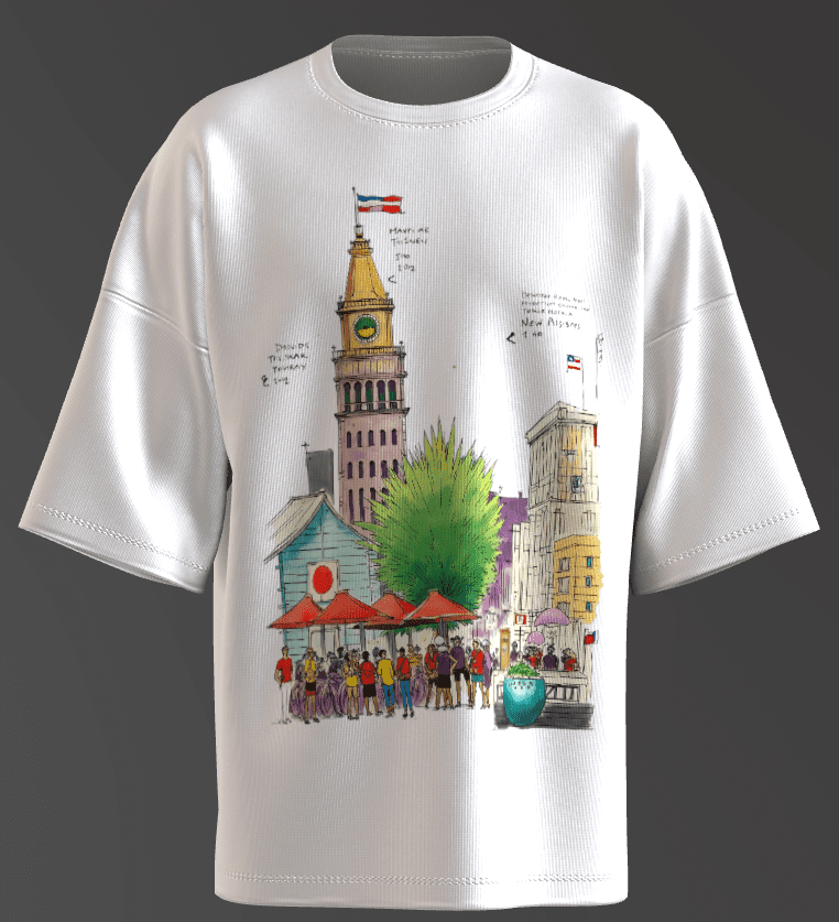 - The artwork is a vibrant, hand-drawn illustration featuring a bustling urban scene centered around a prominent clocktower.
