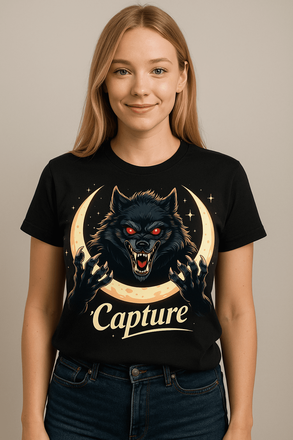 The art piece, featuring a fierce black wolf with glowing red eyes, sharp claws, a crescent moon, and the word “Capture,” draws inspiration from
