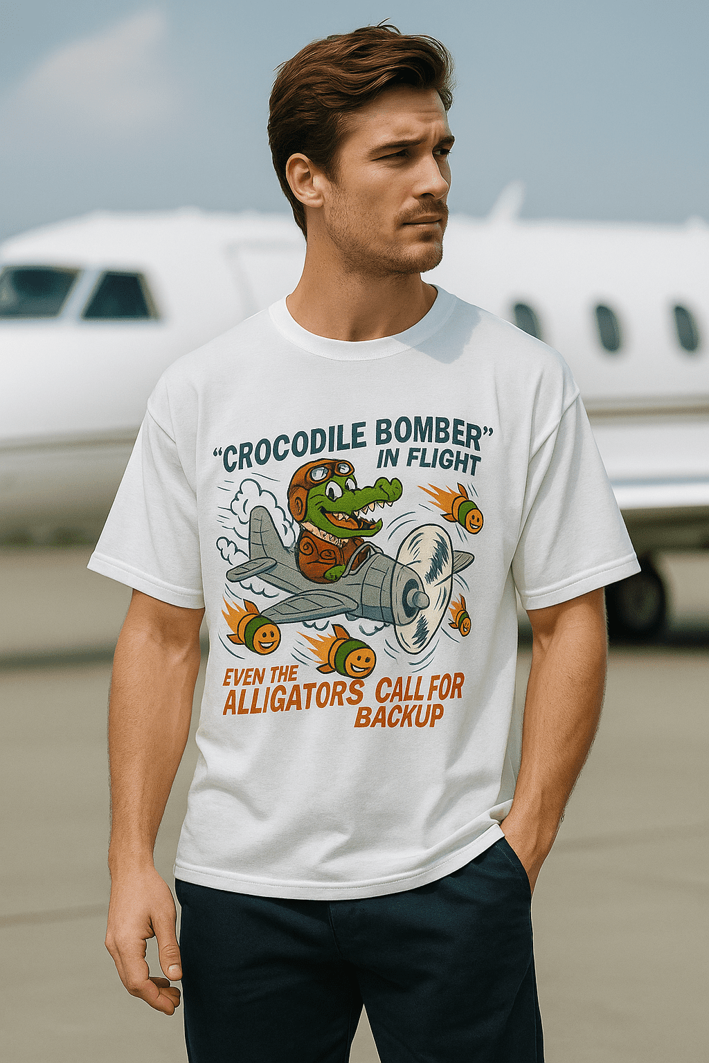 - This Art work of a smiling crocodile pilot and cheerful bombs reflect the whimsical style of classic cartoons (e.g., Looney Tunes), where animals take on human roles with exaggerated, humorous traits.
