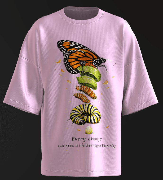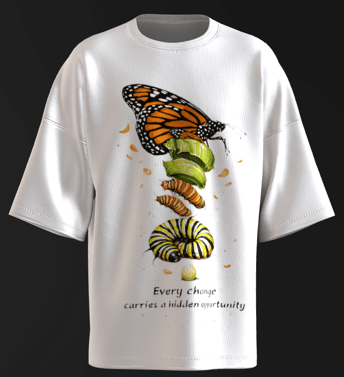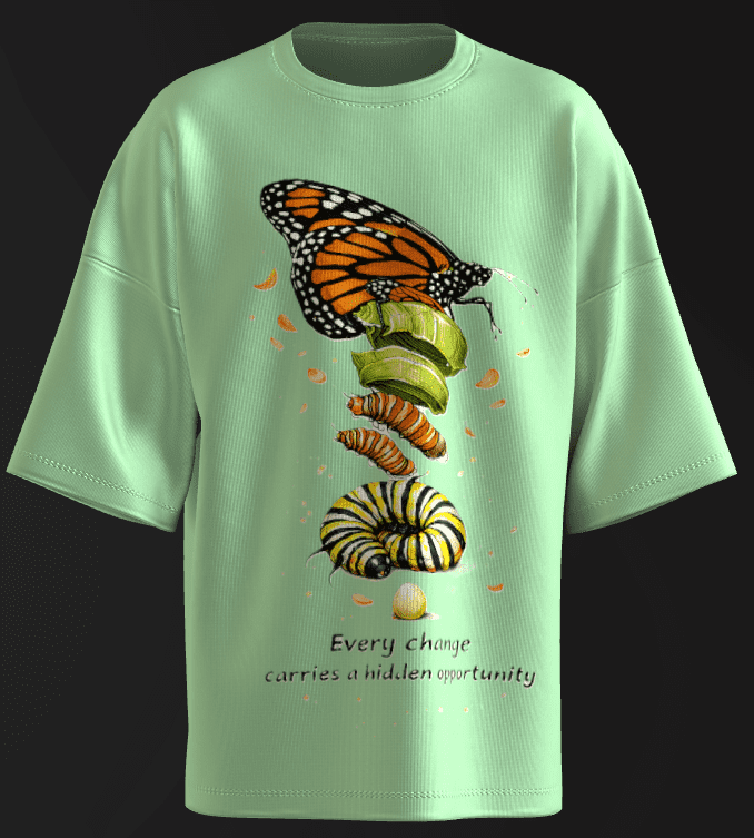 Most metamorphosis art shows four separate illustrations side-by-side. This piece merges all four stages into one unbroken, flowing body — rendered beautifully and visually hypnotic.