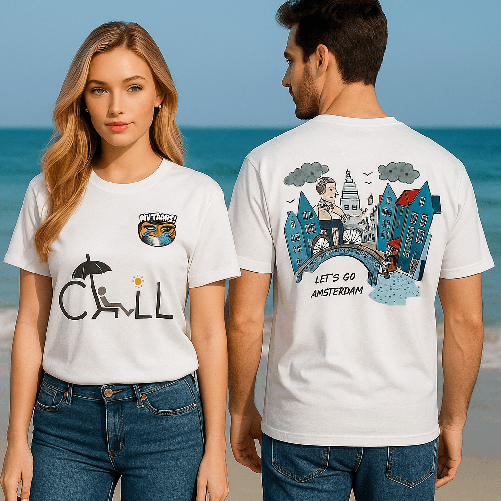 The text “ChiLL” with a relaxing bench in the front and LET’S GO AMSTERDAM” at the back serves as an inviting call to explore the city for the duo or solo travellers.