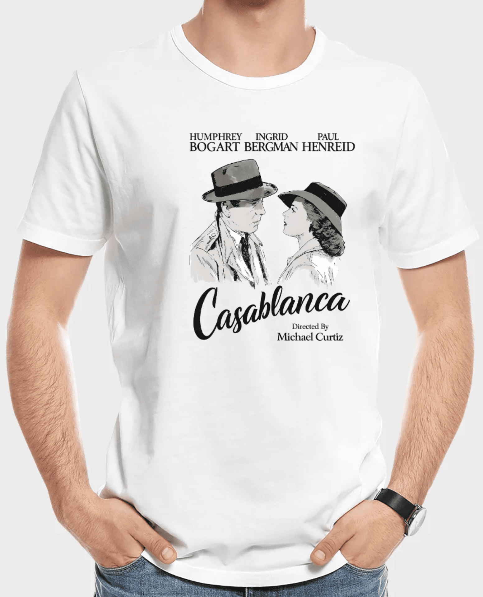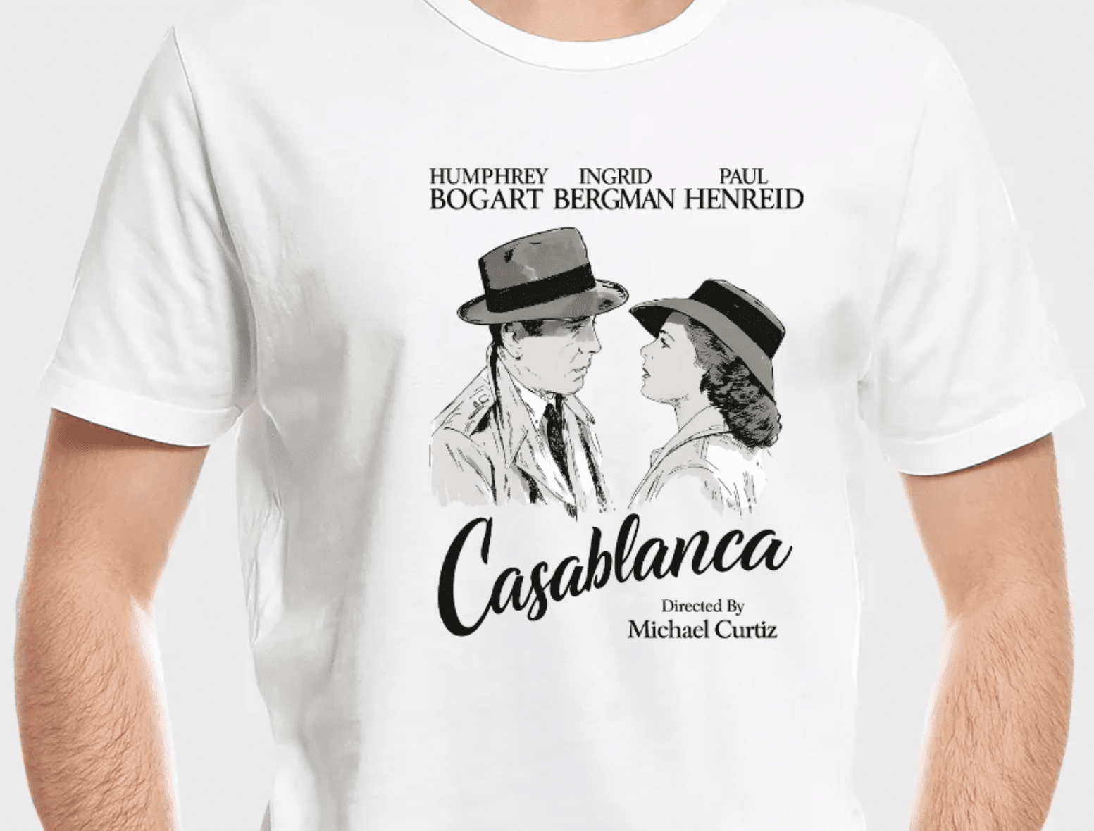 - The Artwork is a stylized, black-and-white sketch of a classic movie poster for Casablanca (1942) featuring Humphrey Bogart and Ingrid Bergman