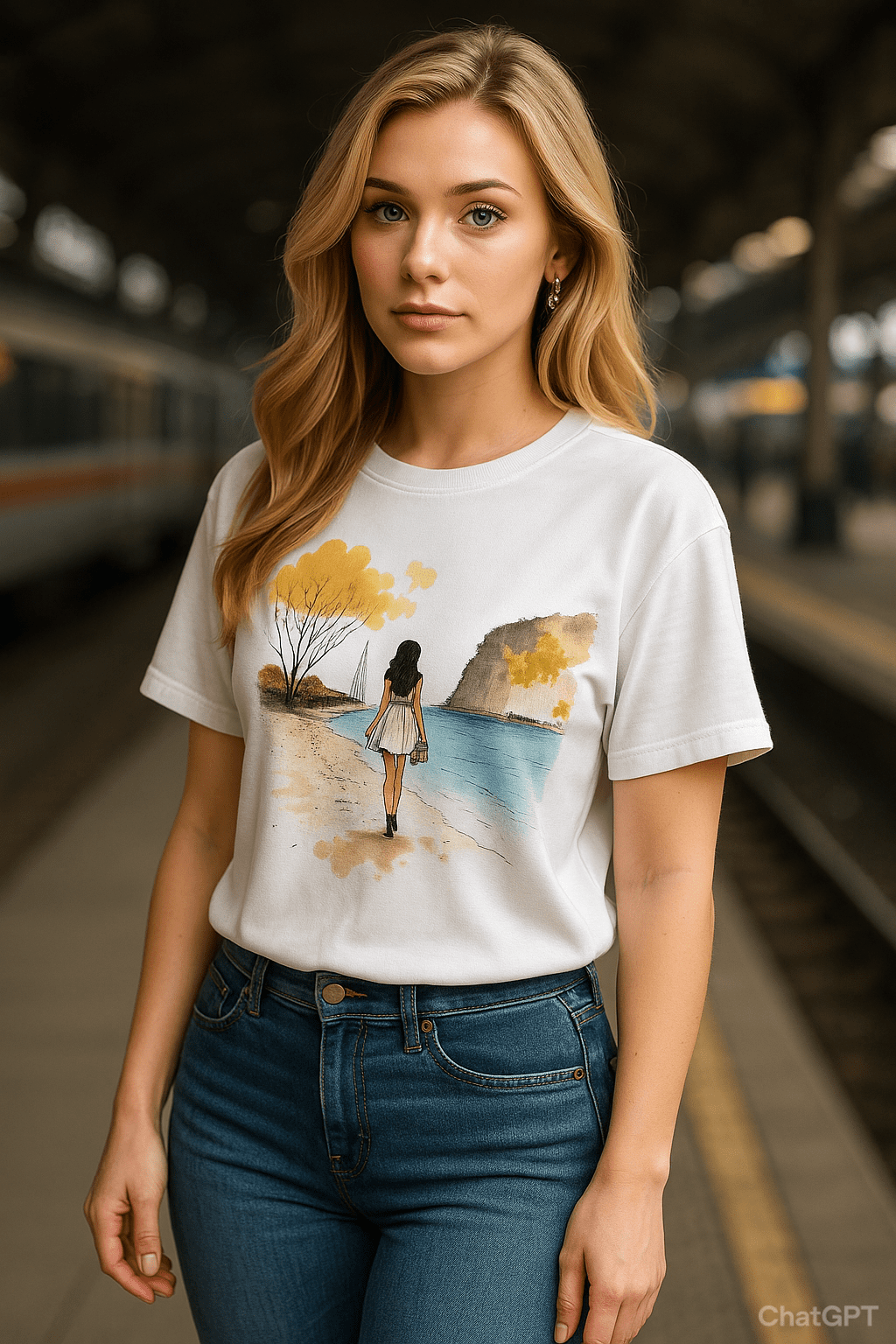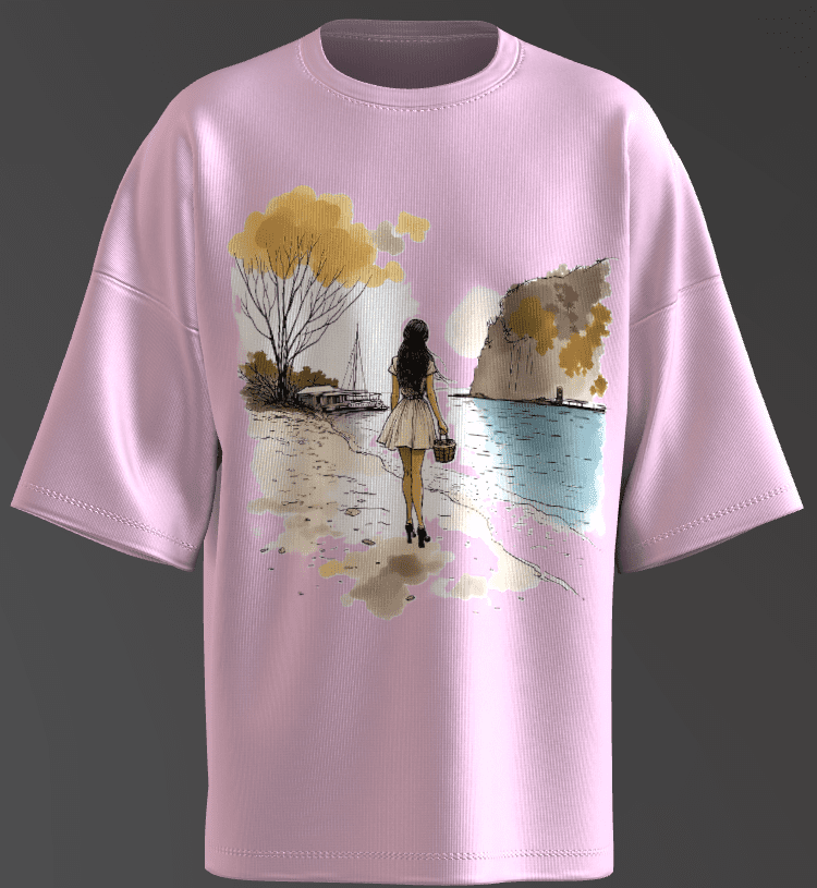 The composition is framed with a gentle asymmetry, drawing the viewer’s eye from the female figure toward the horizon, suggesting a journey or introspection.