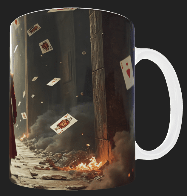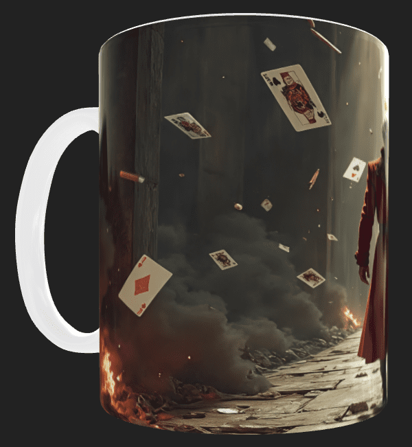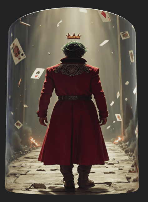 - Around them, playing cards whirl through the air, suspended in a storm of motion and symbolism. The cards — kings, queens, jokers — are fragments of chance, luck, and power, suggesting a world ruled as much by fate as by will.