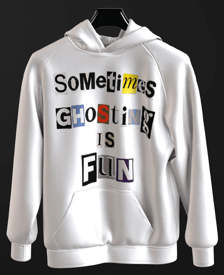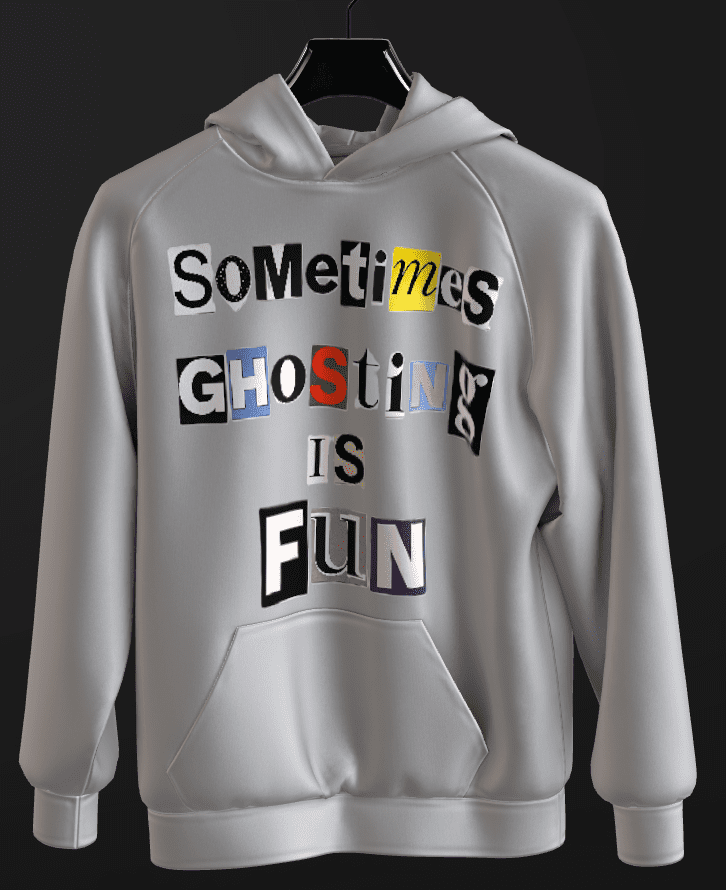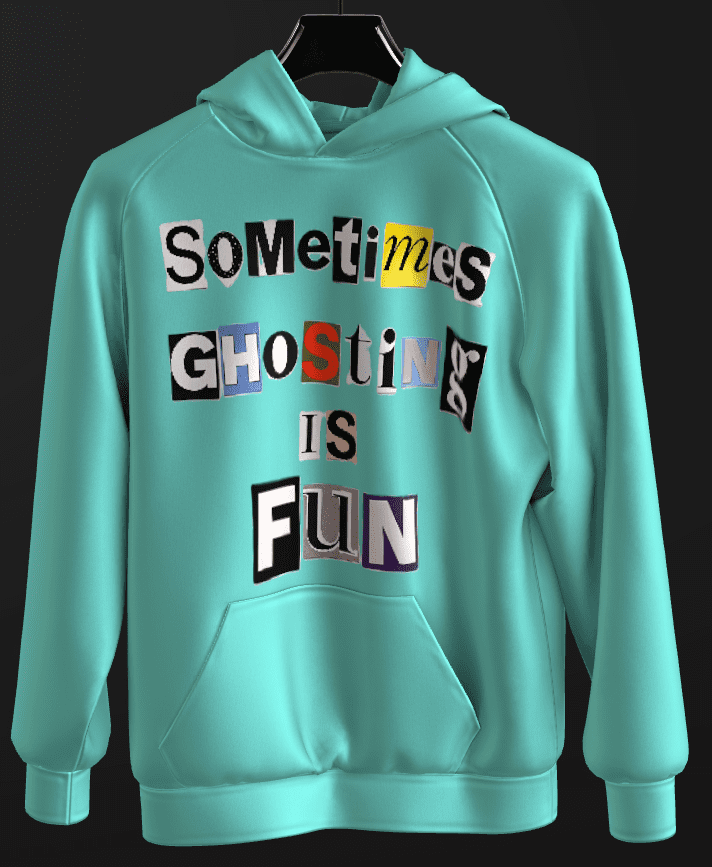 • This playful ransom-note collage spells out “Sometimes Ghosting is Fun” in a riot of mismatched letters—bold primaries clashing with pastels like a spectral party crasher.