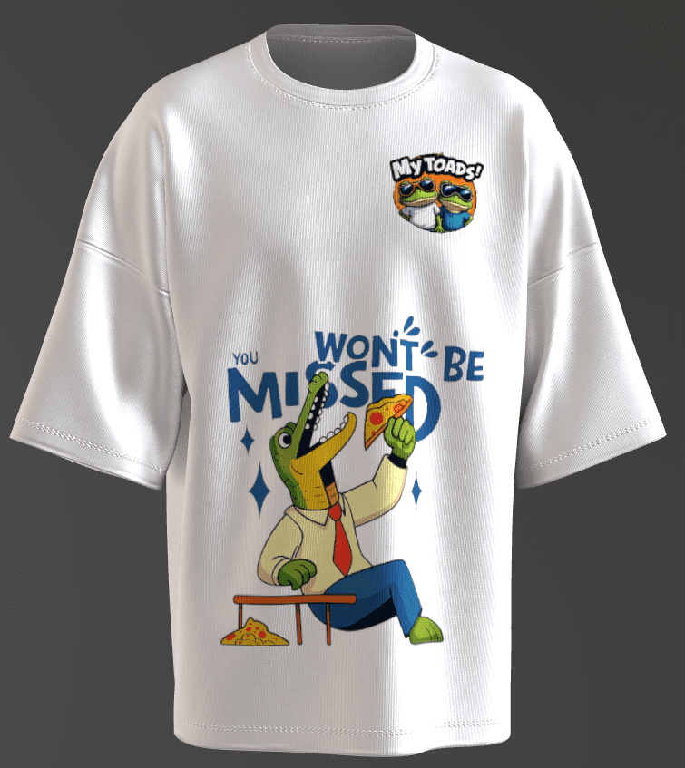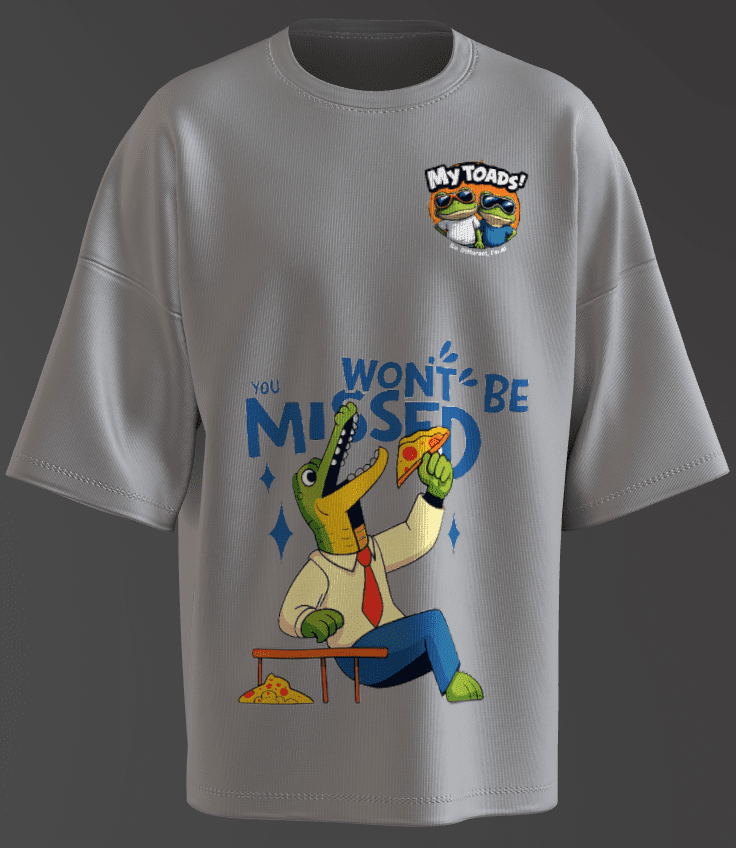 The phrase “YOU WON’T BE MISSED” could be a nod to sarcastic or ironic humor, possibly hinting at the alligator “retiring” from its wild life to enjoy a simpler existence, or even a playful jab at someone or something being replaced by this quirky character.