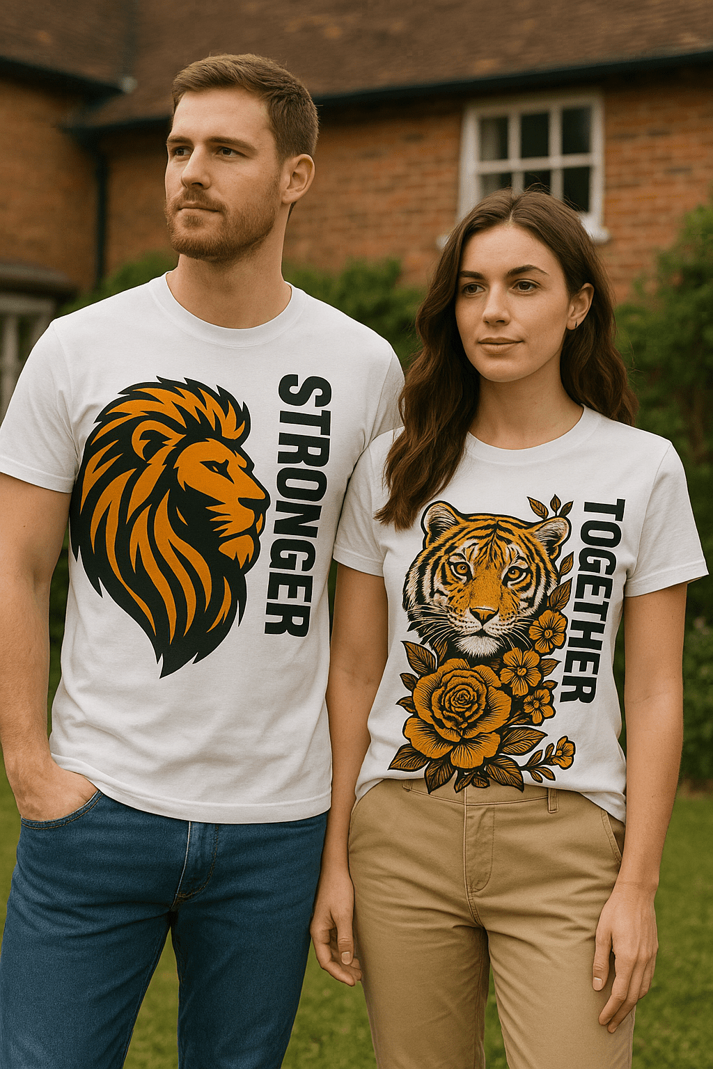 - The artwork features a matching design for a couple, blending a lion and a tiger with the unifying theme “Stronger Together.