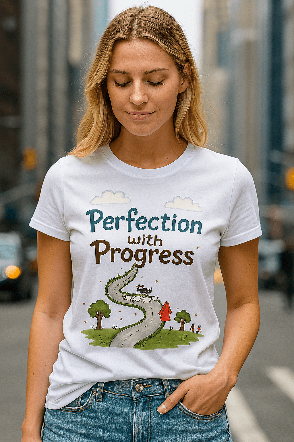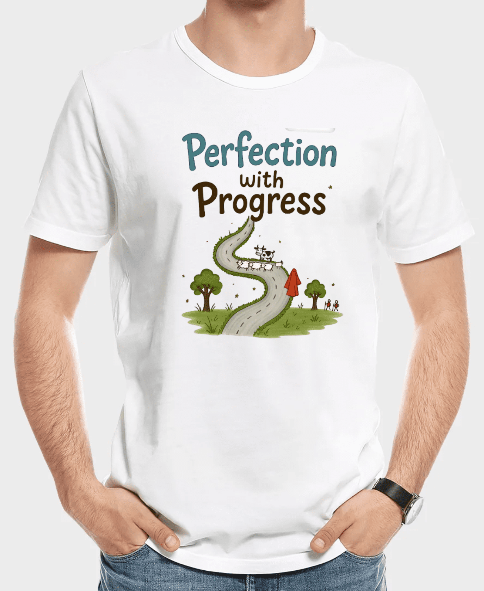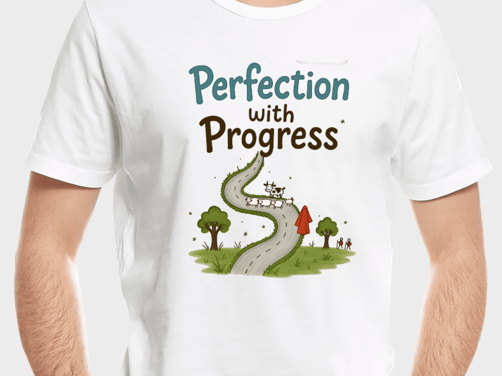 - This whimsical art featuring sheep, a winding road, and the theme “Perfection with Progress” inspires a sense of journey and growth.