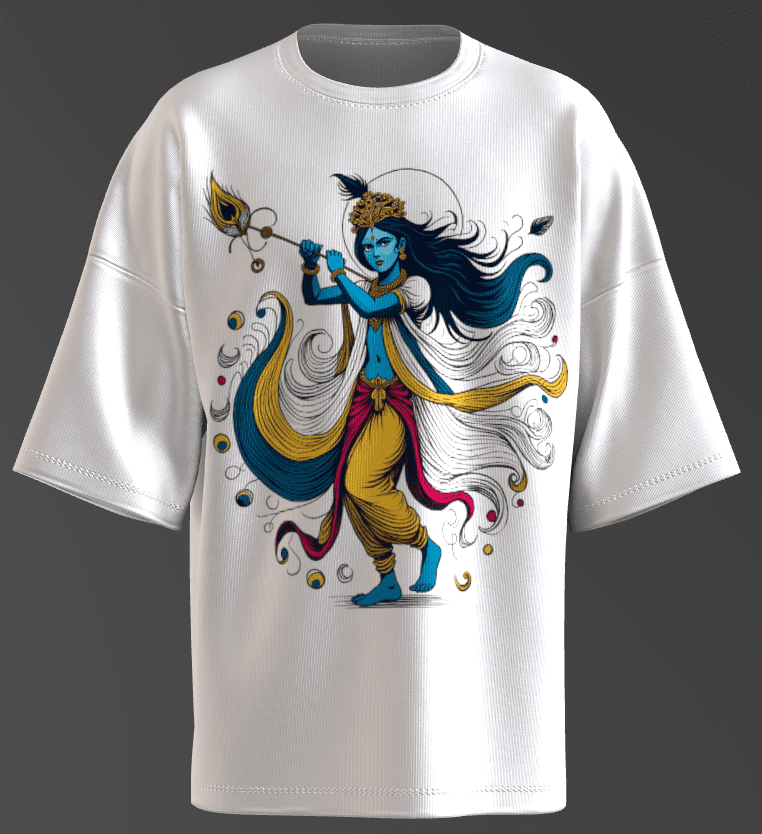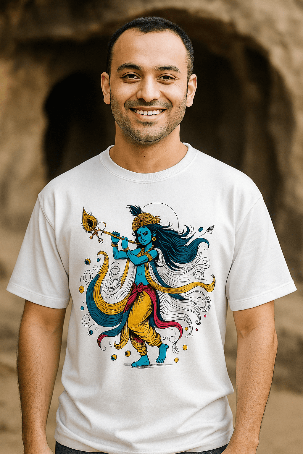 Krishna is depicted with his iconic blue skin, symbolizing his divine nature. The blue hue often represents infinity and transcendence, tying to his role as an incarnation of Vishnu, a supreme deity.