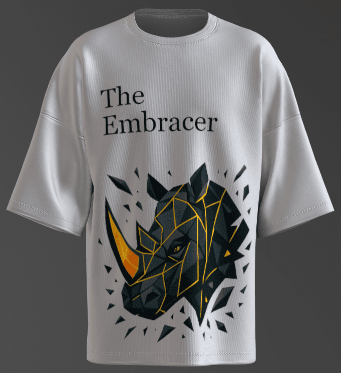 - The text ” The Embracer” signifies the takeaways from Rhinos Calmness while being Powerful, and embracing its co existence with humans in today’s world.