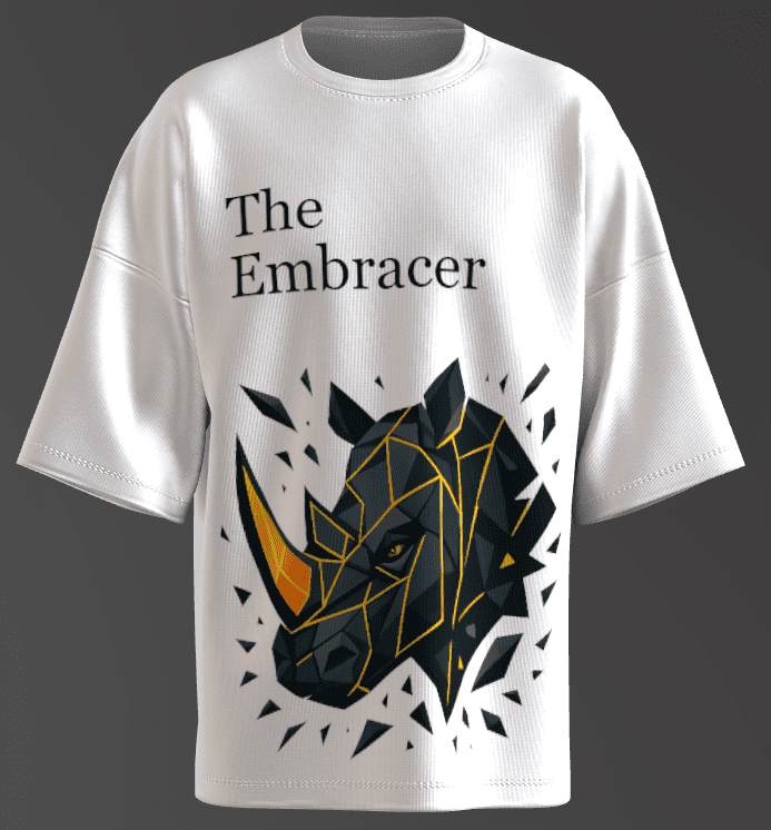 • The text ” The Embracer” signifies the takeaways from Rhinos Calmness while being Powerful, and embracing its co existence with humans in today’s world.