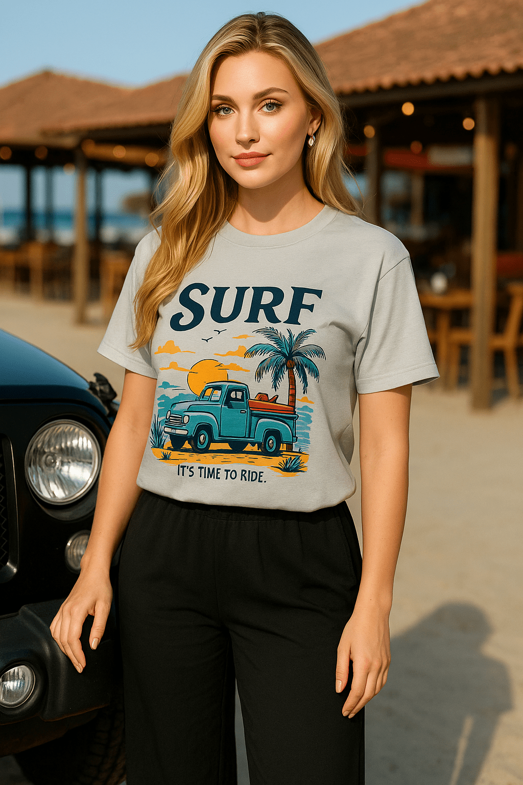 The stylized, almost cartoon-like rendering gives it a fresh, contemporary twist while retaining the nostalgic charm of the old-school truck and surfboards.