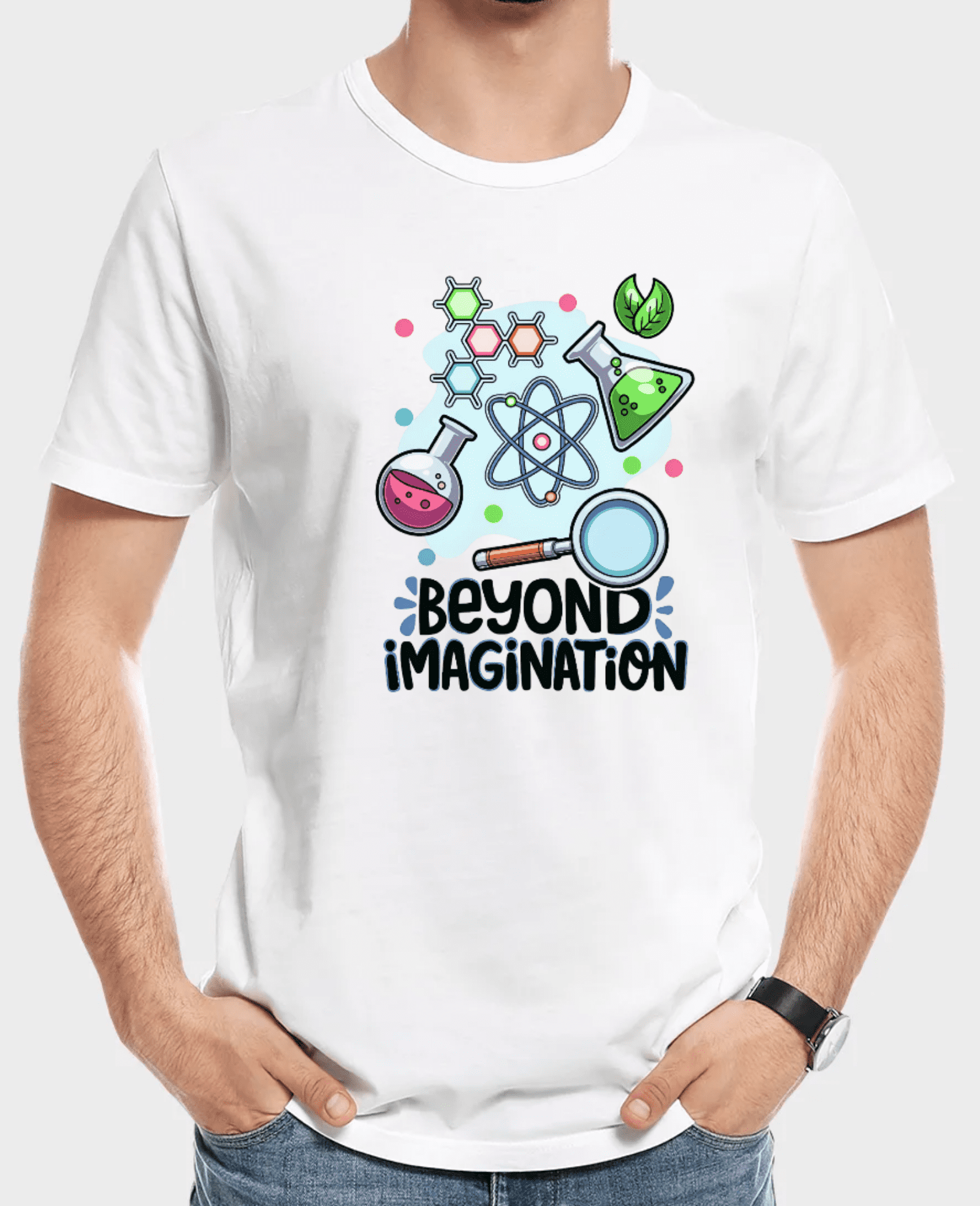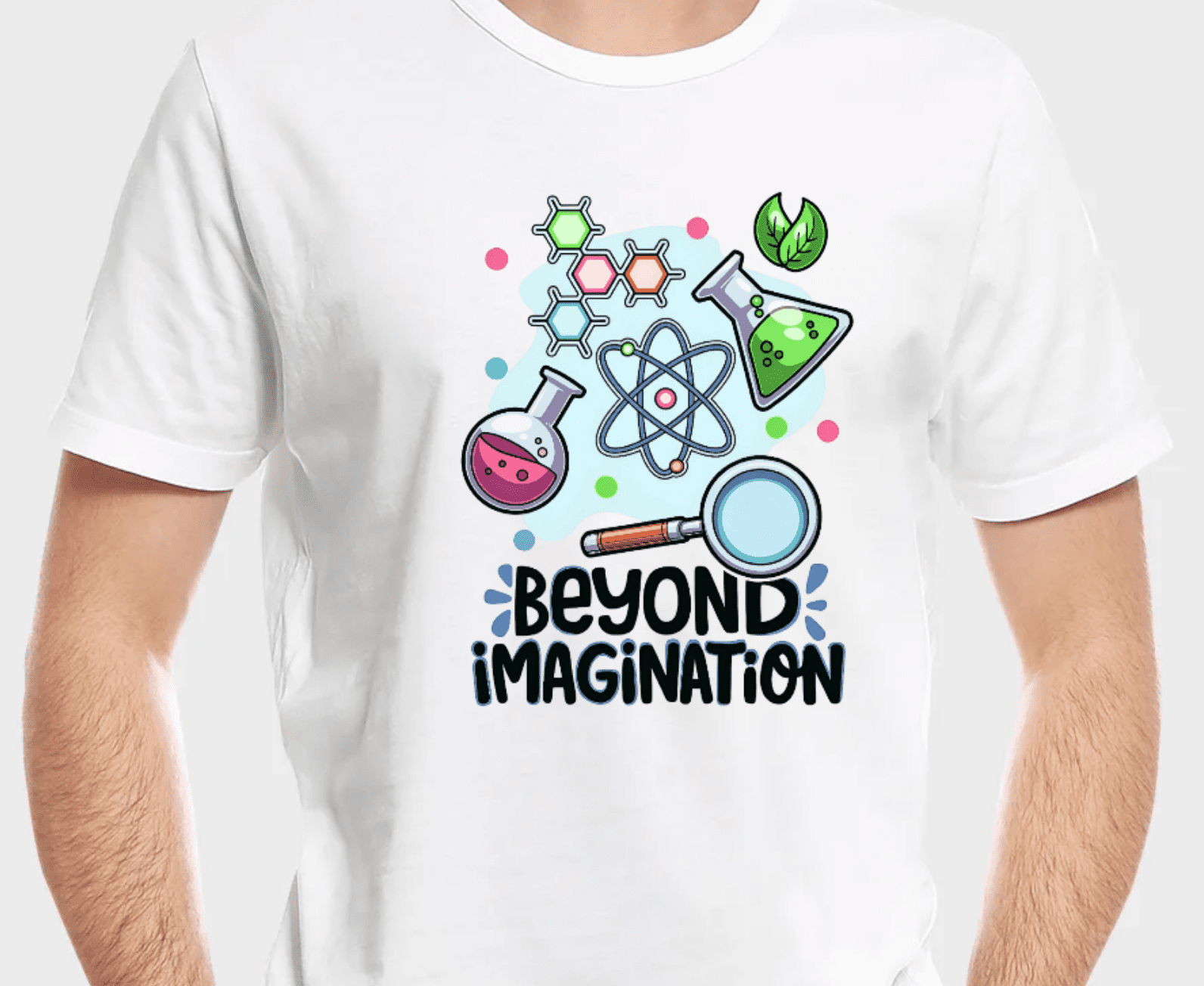 • The artwork is a vibrant, playful illustration that blends scientific elements with a sense of wonder and creativity.