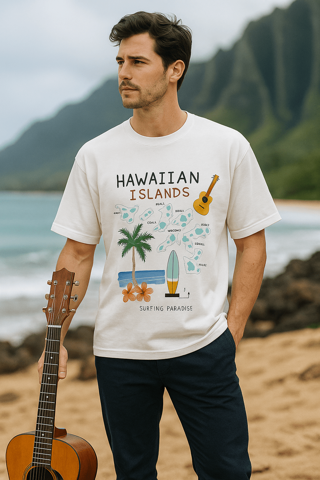 - The artwork is inspired by Hawaii’s rich cultural tapestry and natural beauty. The inclusion of the ukulele nods to traditional Hawaiian music, while the surfboard and palm tree reflect the islands’ global fame as a surfing and tropical getaway destination.