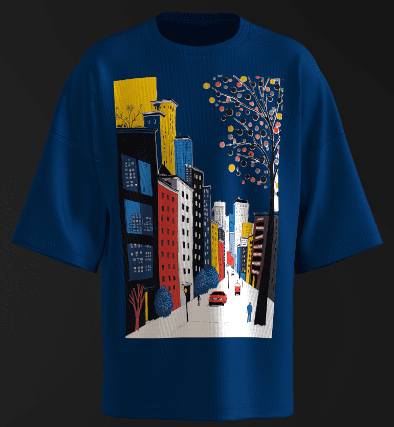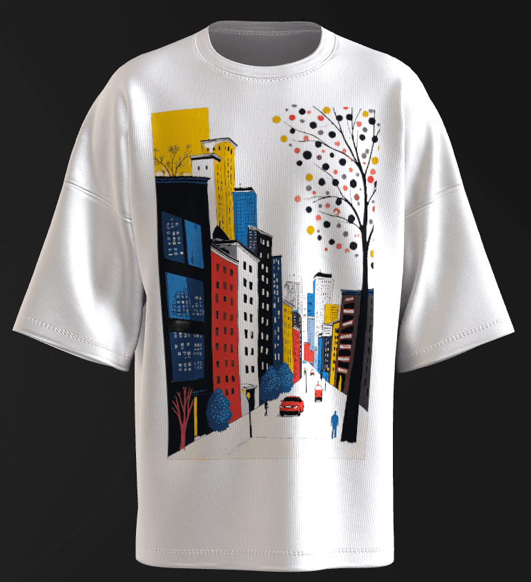 Buildings are painted in pure primaries (red, yellow, blue) plus black and white — almost like a child’s building-block set brought to life. This creates instant joy and optimism.