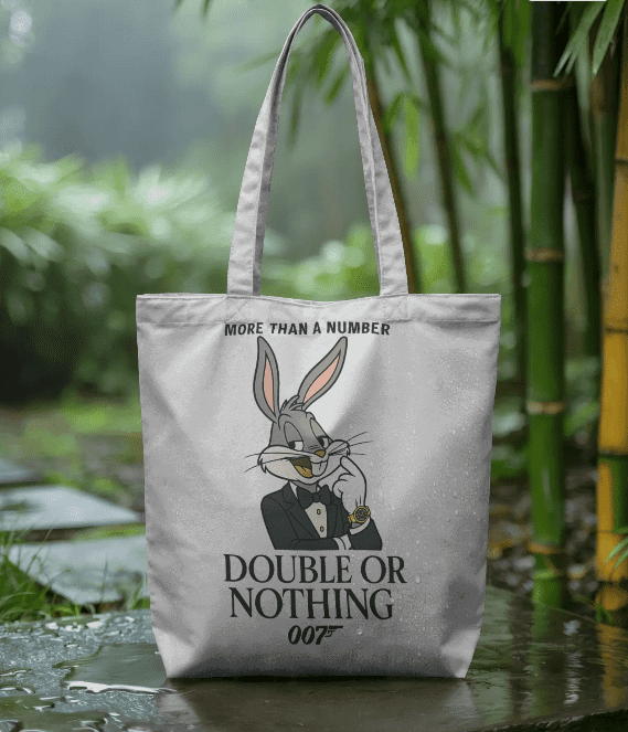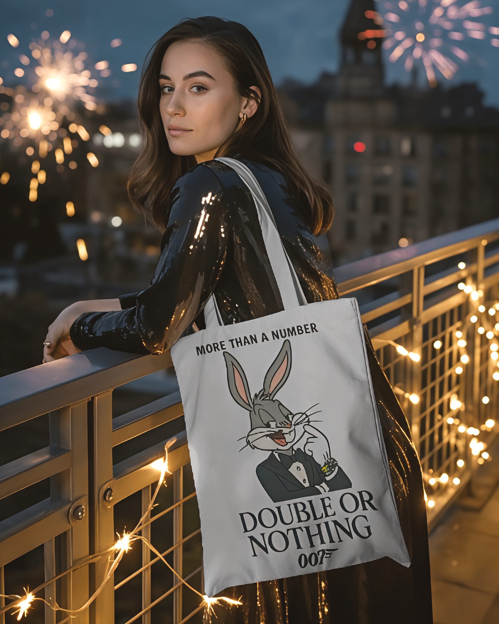 The “Double or Nothing” phrase hints at a risky mission or bet, aligning with Bond’s adventurous spirit, while the carrot-eating rabbit adds a layer of absurdity to the spy narrative.