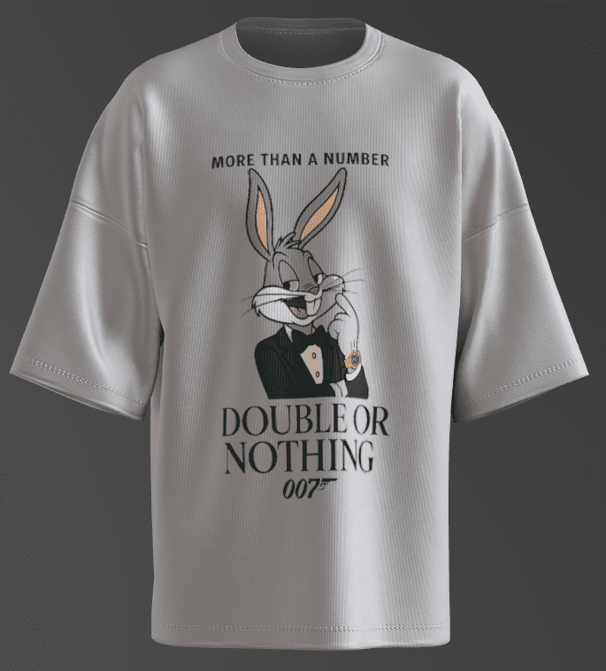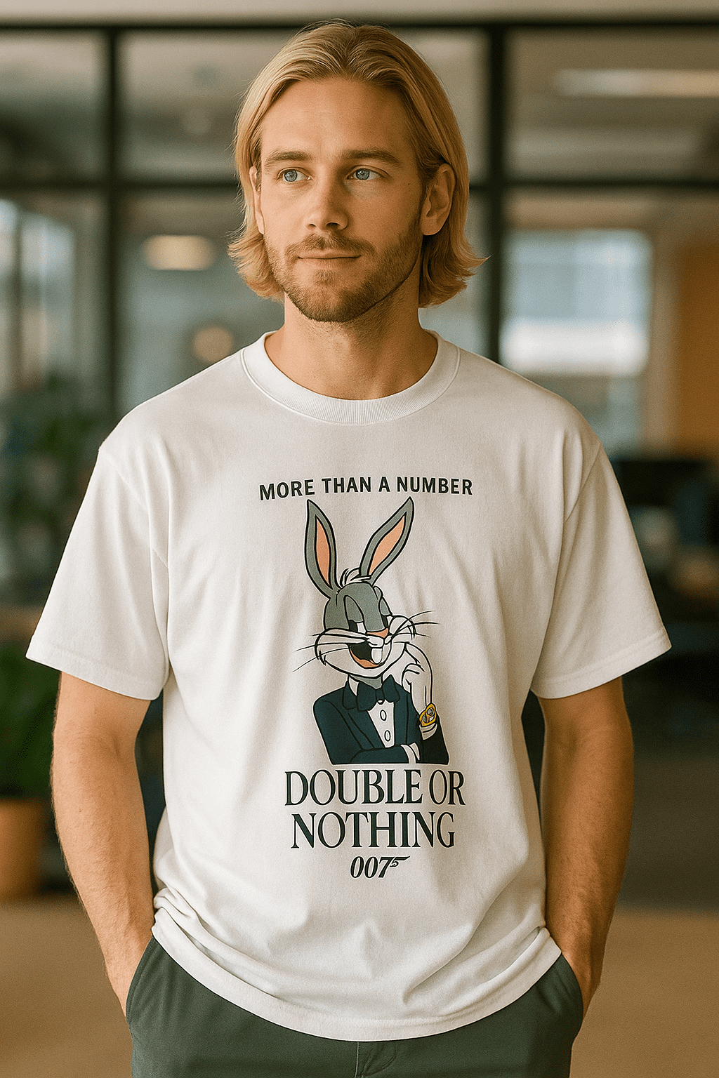 The “Double or Nothing” phrase hints at a risky mission or bet, aligning with Bond’s adventurous spirit, while the carrot-eating rabbit adds a layer of absurdity to the spy narrative.