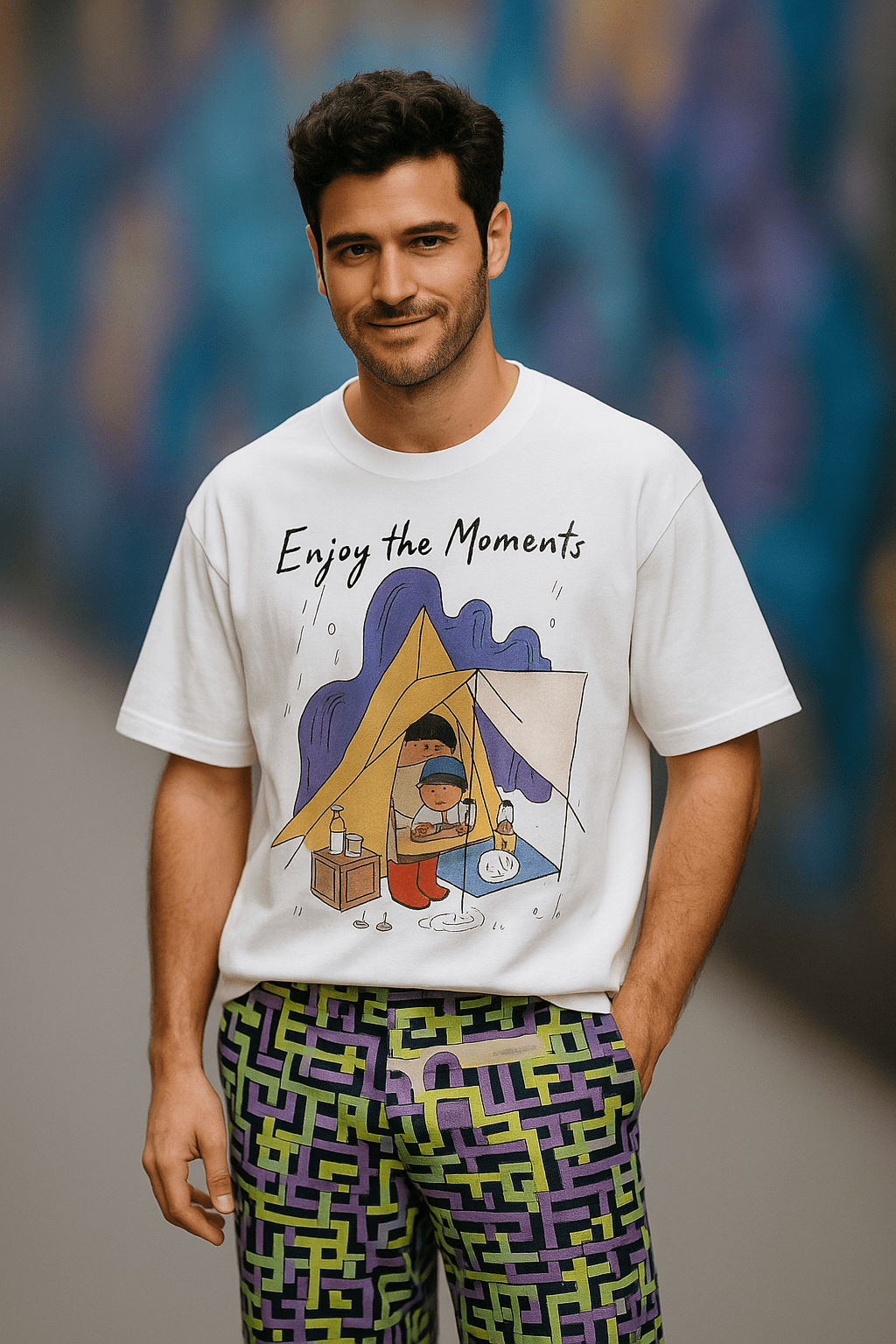 - The art work inspires people who enjoy hiking, tent camping, or van life, reminding that rainy trips can be memorable keeping the focus on the tent and its inhabitants, while dynamic rain lines and puddles add movement and atmosphere.