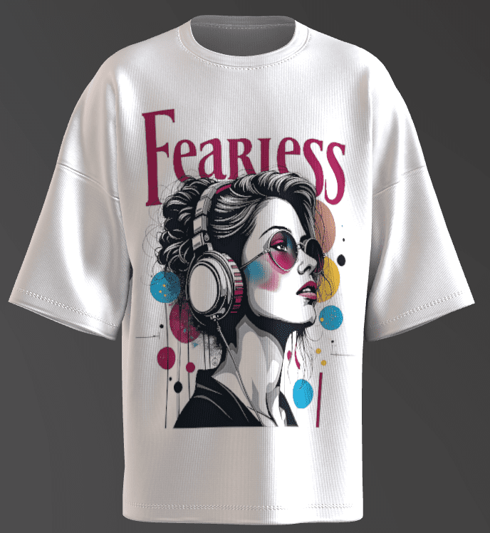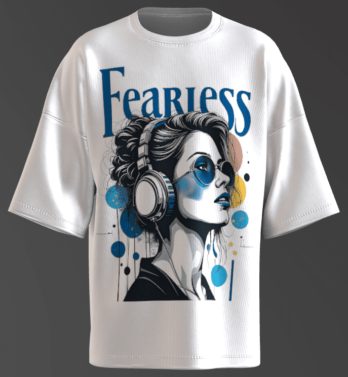 • The artwork features a stylized illustration of a woman wearing large headphones, with the word “Fearless” prominently displayed in bold letters at the top.