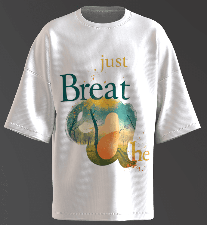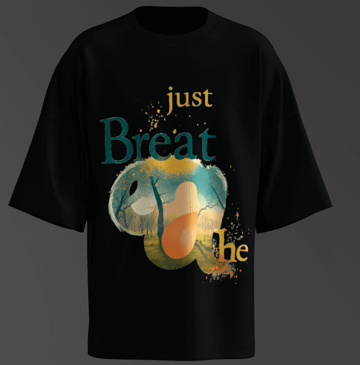 - The artwork features a striking composition with the phrase “just Breat” (intended as “just Breathe”) in bold, stylized text where the word “Breat” is rendered in a teal hue, while “just” and “he” are in a warm yellow,
