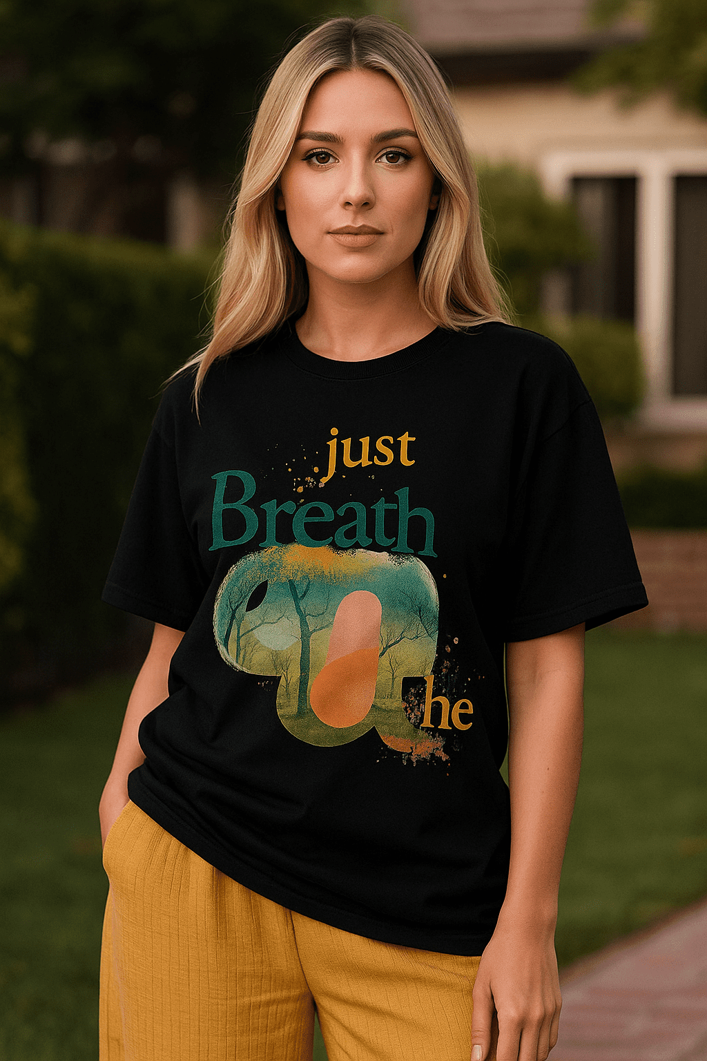 The central “just Breathe” message serves as a gentle reminder to pause and find calm, using the woods as a metaphor for grounding.