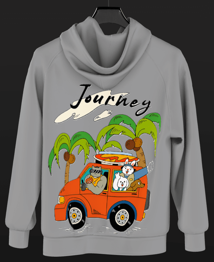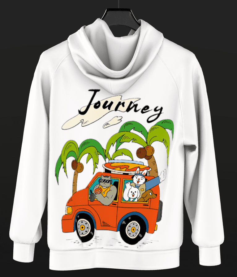 The exaggerated features, like the cat’s muscular arms and the bunny’s joyful wave, create a humorous yet endearing tone that’s rare in typical travel art, making it stand out as a fresh take on adventure themes.