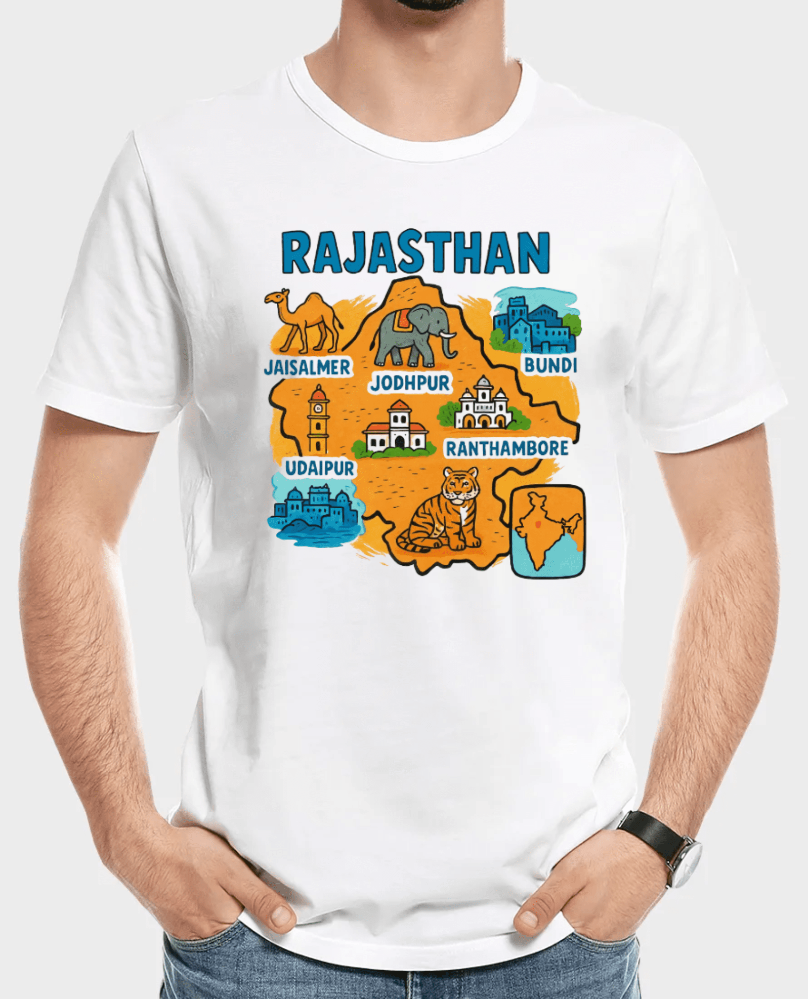 The piece uses a stylized, hand-drawn approach to capture the essence of Rajasthan through its geography, culture, and iconic symbols.