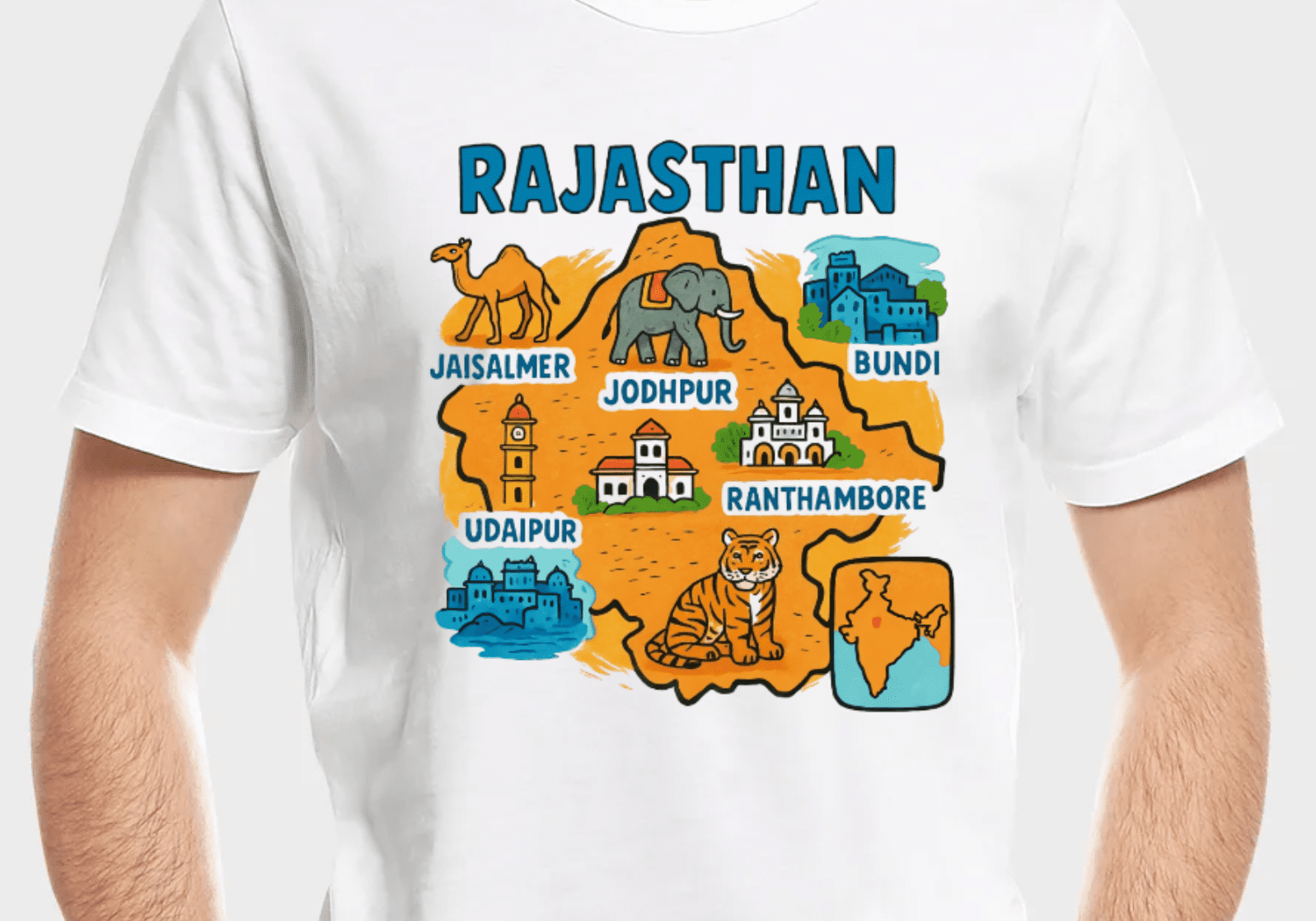 - This artwork is a detailed and vibrant illustrative map of Rajasthan, a state in northwestern India known for its rich history, desert landscapes, and royal heritage.