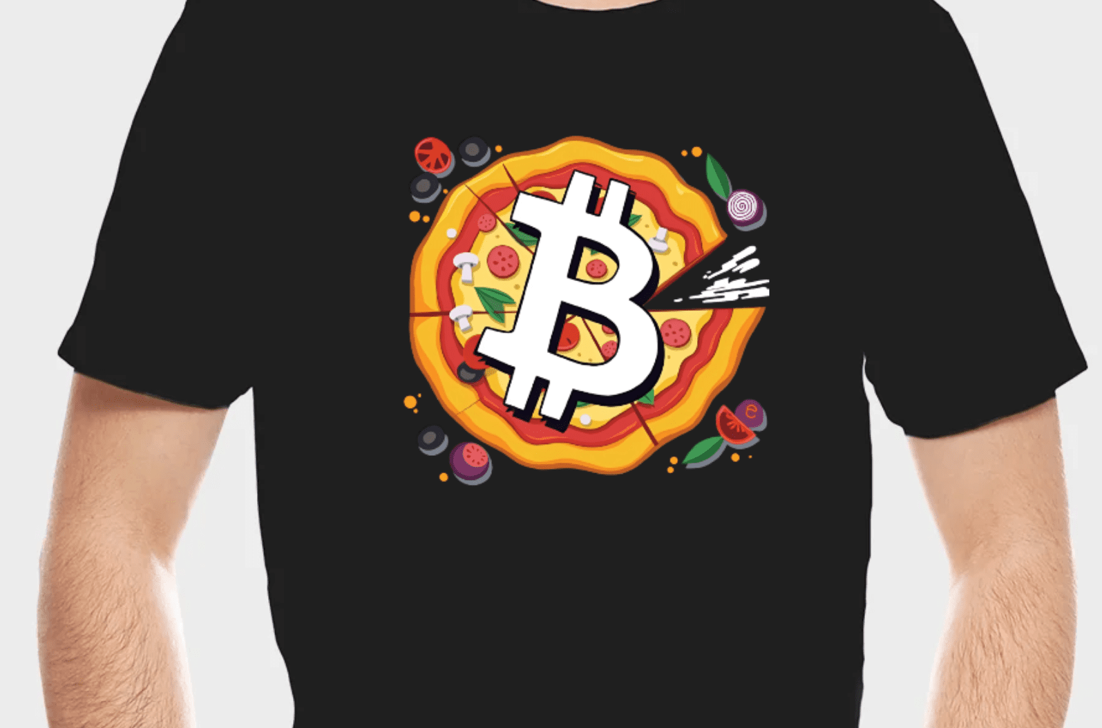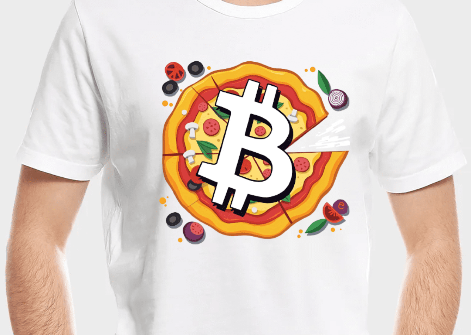 The artwork features a vibrant, colorful pizza with a bold Bitcoin symbol (₿) prominently placed at its center, blending the worlds of cryptocurrency and culinary delight.
