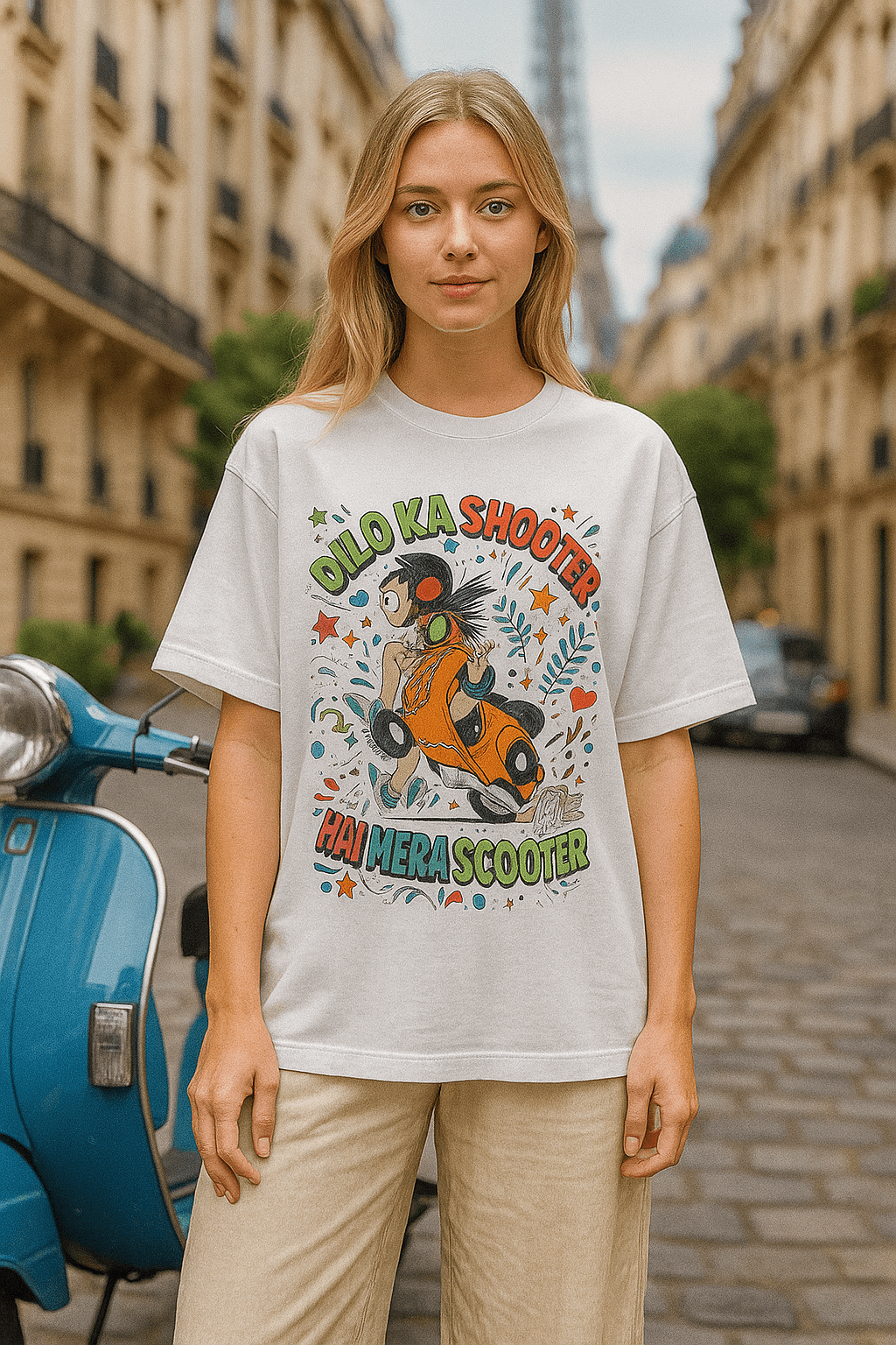 The phrase “Dilo Ka Shooter”, “Hai Mera Scooter” is a playful pun, possibly implying the character “shoots” love or excitement with their scooter, which is a lighthearted twist.