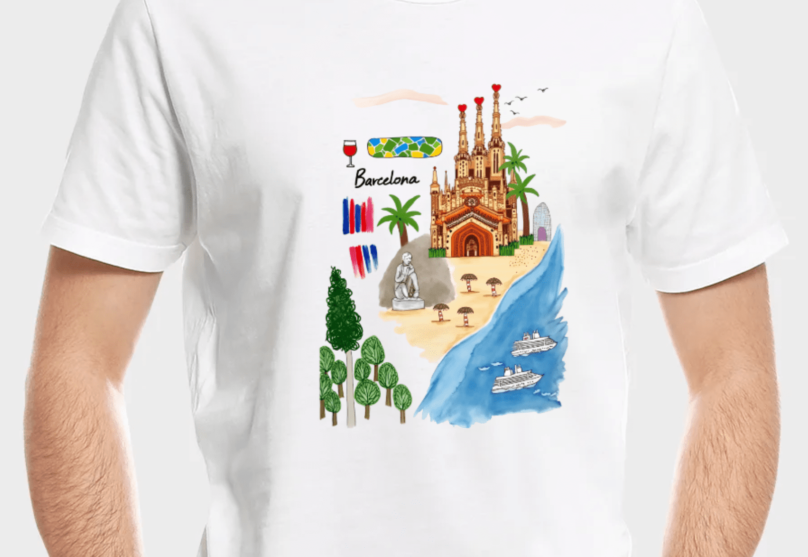 The artwork portrays Barcelona as a city of contrasts and harmony where urban life blends seamlessly with natural beauty (the beach and sea), and where creativity (mosaics, art) and leisure (wine, beach) coexist.
