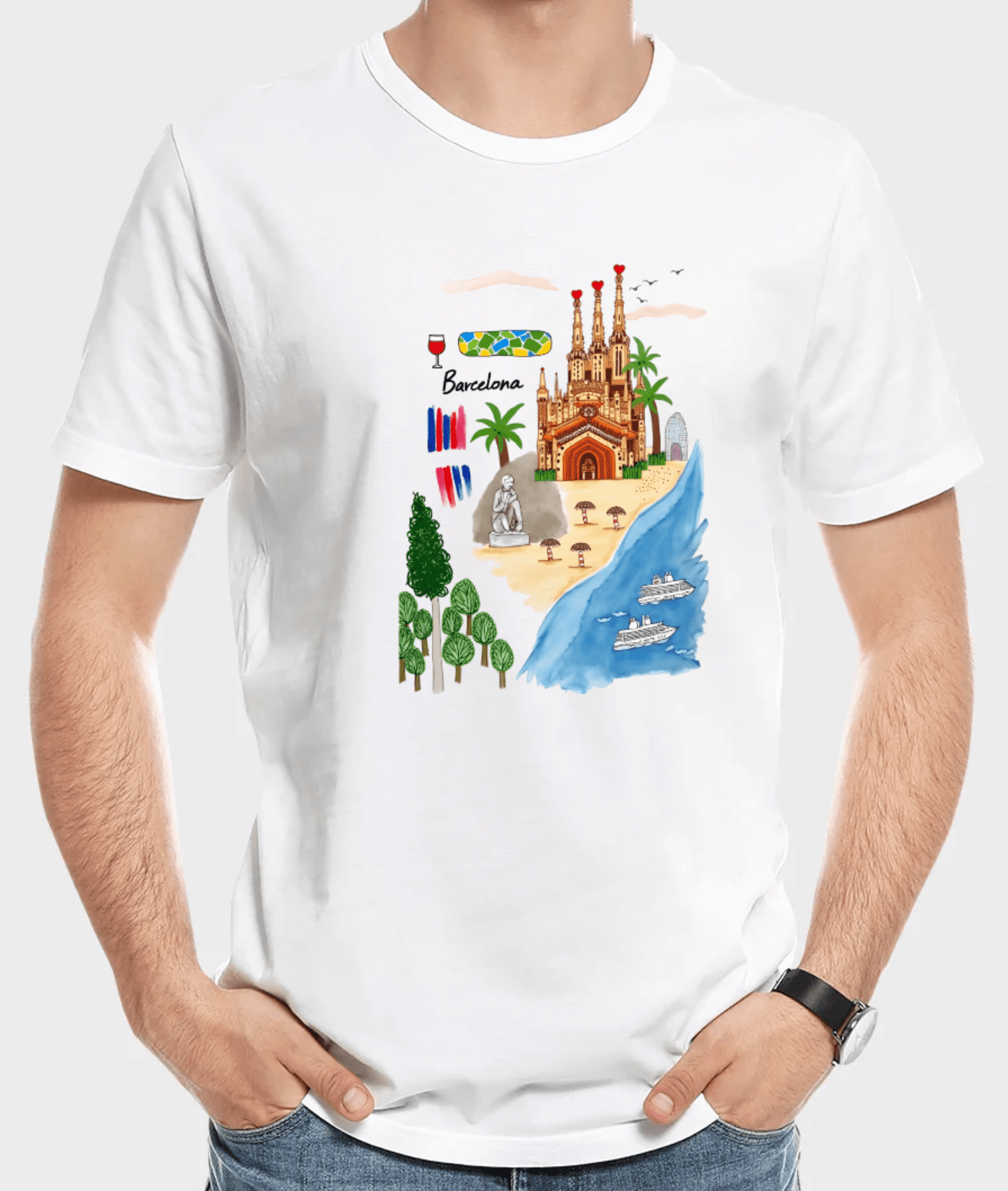 - This artwork is a whimsical, watercolor-style illustration that captures the essence of Barcelona, blending its iconic landmarks, cultural elements, and coastal charm into a dreamy scene.