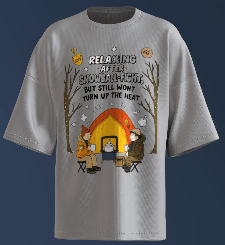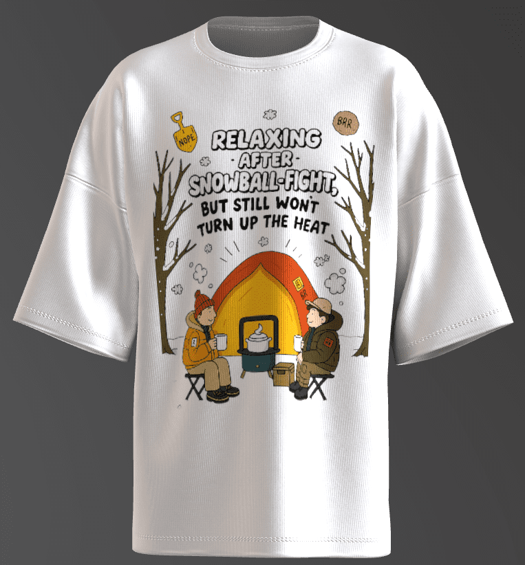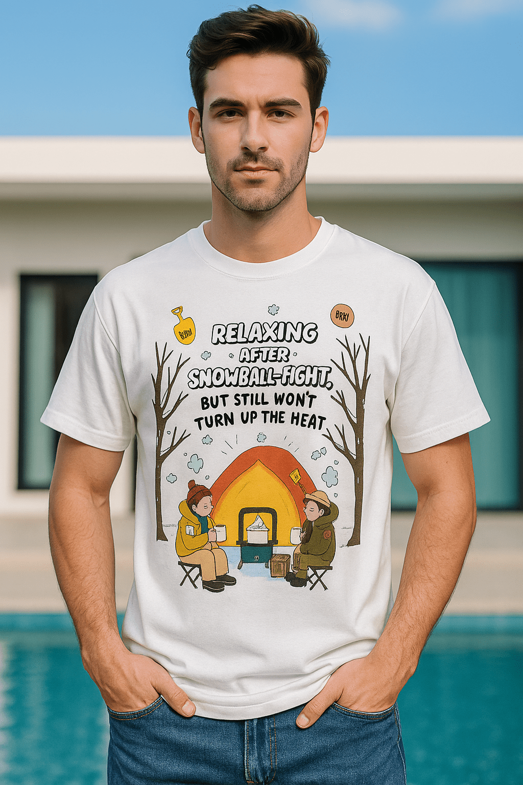 The humor shines through in the contradiction of “relaxing” while freezing, underscored by the refusal to “turn up the heat.” The “NOPE” shovel and “BRR” cloud add a cheeky, exaggerated touch, as if the environment itself is mocking their efforts.