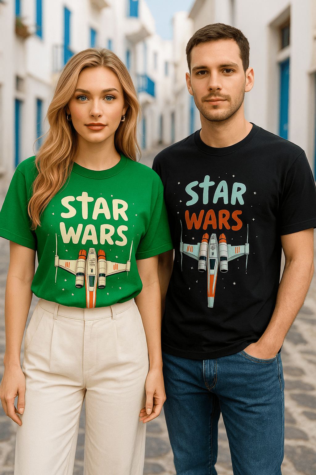 - The Ai artwork on the T-Shirt draws inspiration from the rich visual legacy of Star Wars, particularly the original trilogy’s aesthetic, where the X-Wing symbolizes heroism and the Rebel Alliance’s fight against the Empire.
