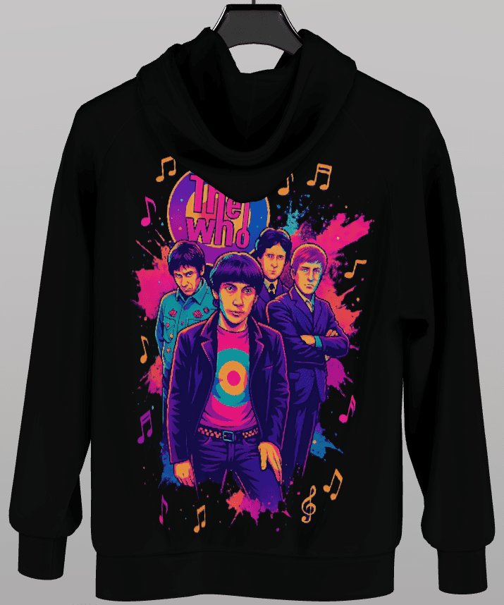 • This artwork is a stunning, high-energy digital illustration that reimagines the legendary British rock band The Who in a hyper-vivid, retro-futuristic style.