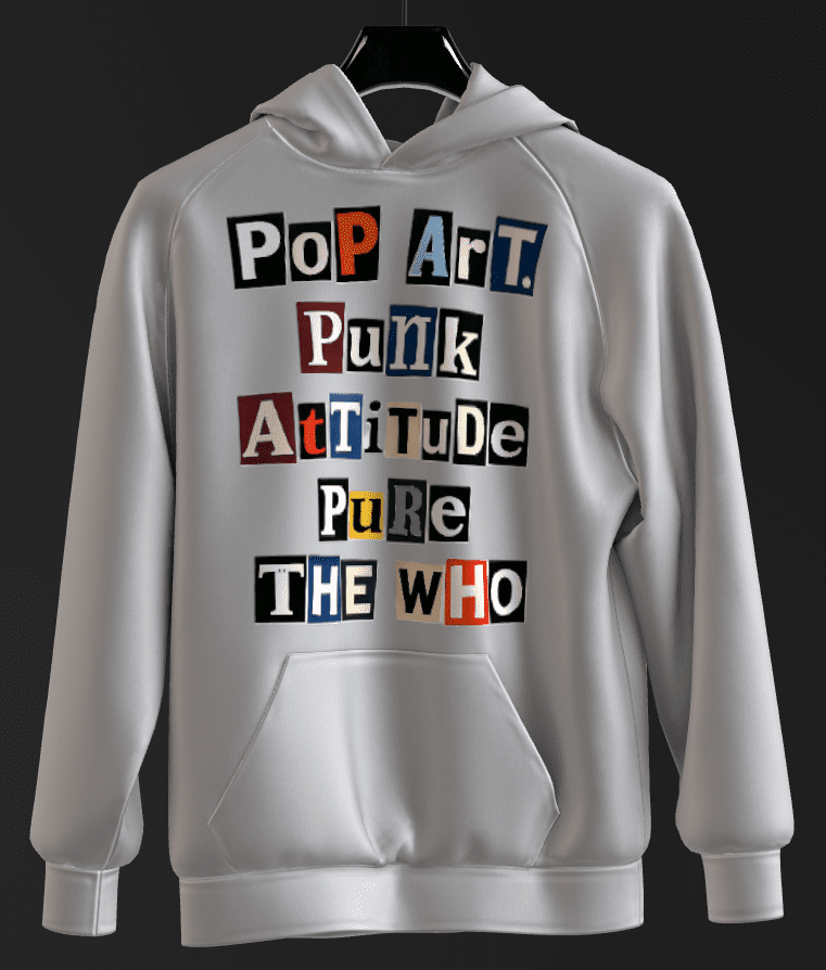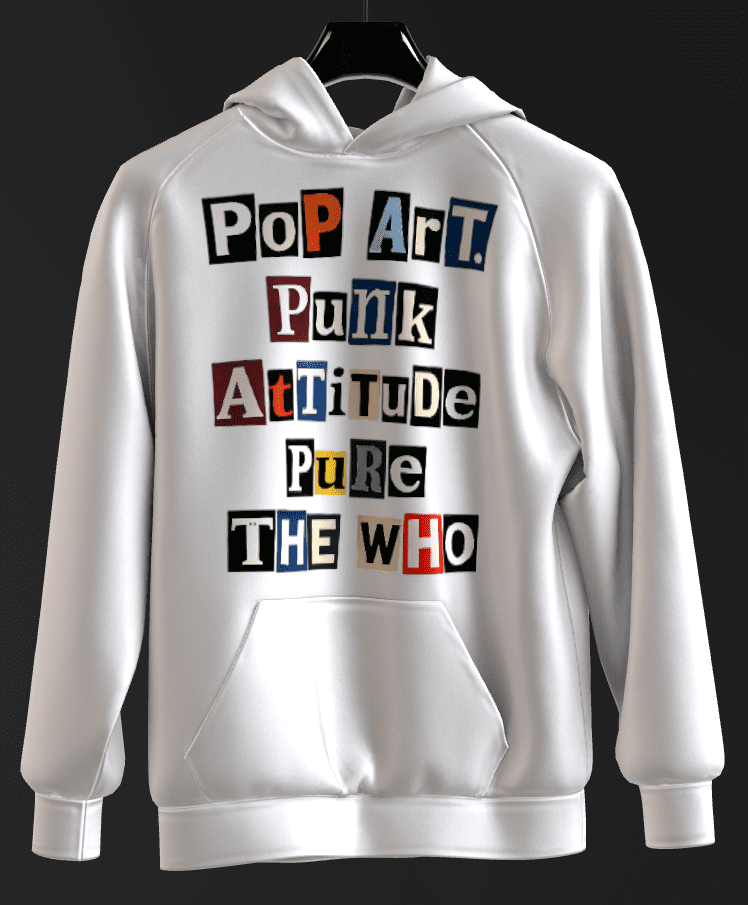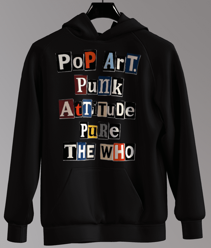 • A high-contrast collage that spells out “Pop Art. Punk Attitude Pure The Who” using jagged, mismatched letters clipped and rearranged like forbidden headlines from a subversive scrapbook.