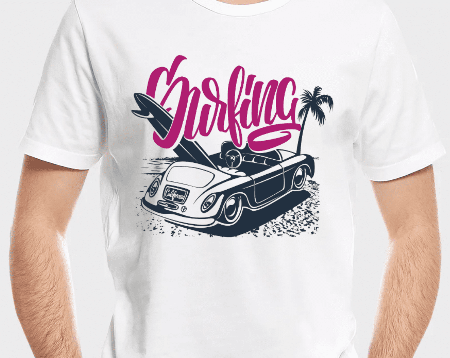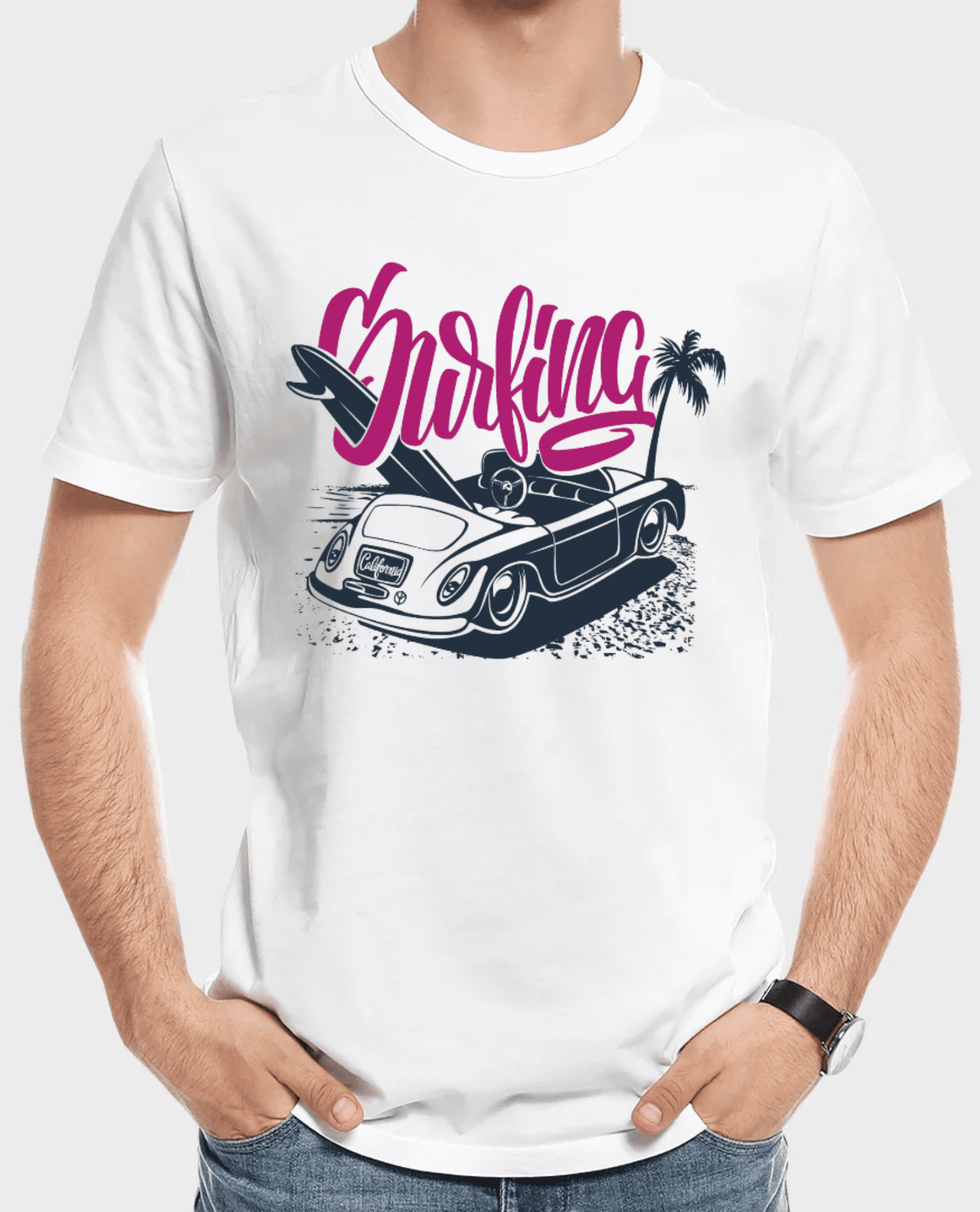 The combination of elements—surfing, a convertible, and a palm tree—paints a picture of an idealized beach lifestyle, appealing to those who dream of sun, sea, and open roads.