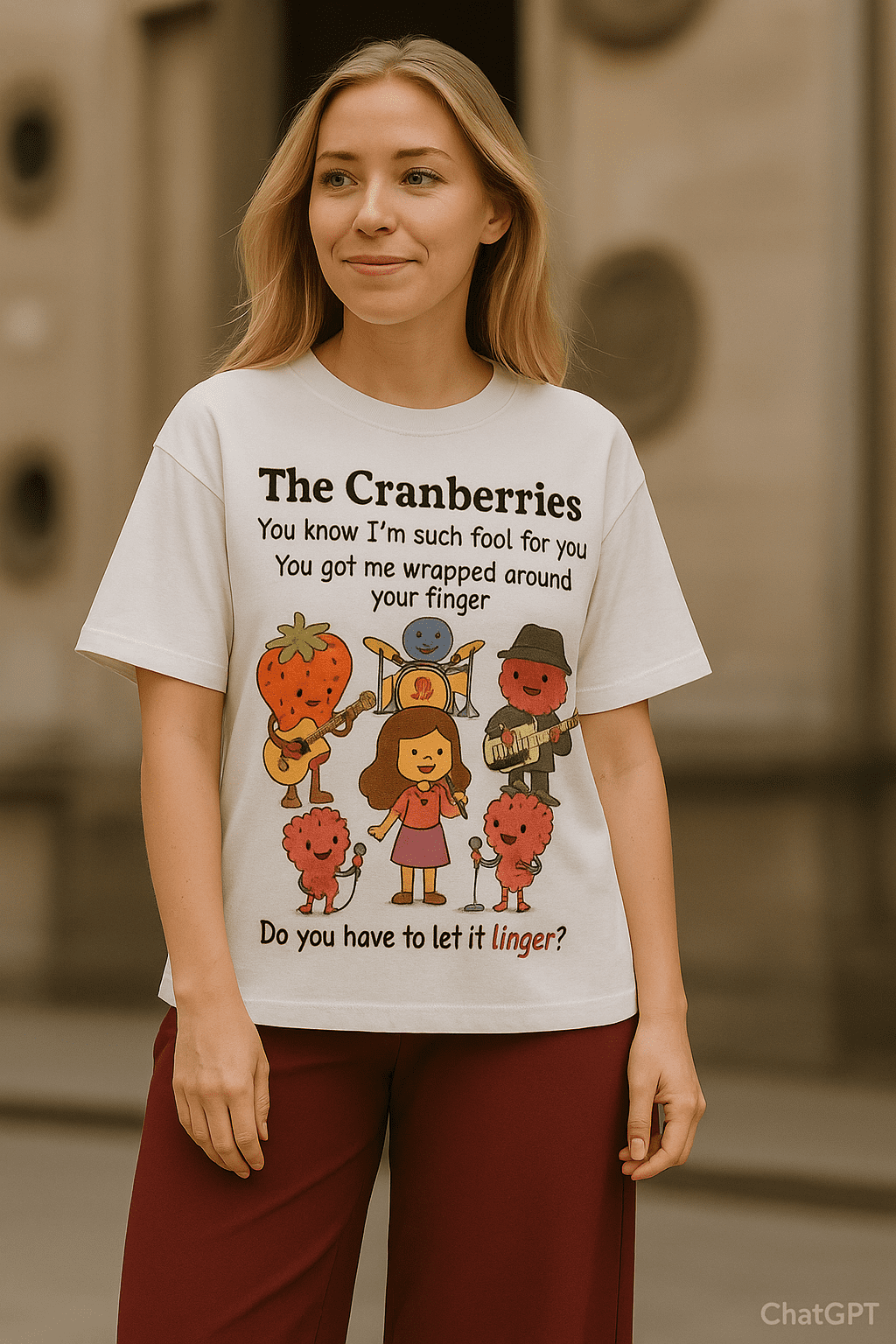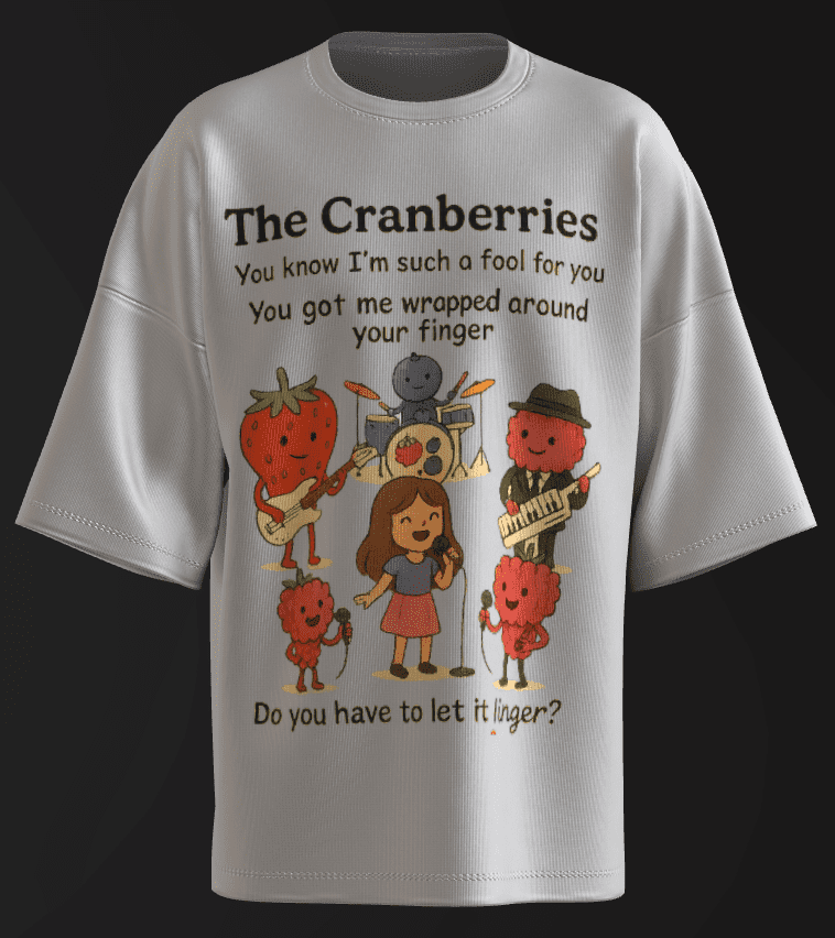 - What makes this piece stand out is the Perfect fusion of visual pun + accurate song lyrics—it doesn’t just show “cranberries as a band,” it specifically illustrates “Linger” with the exact lines displayed.