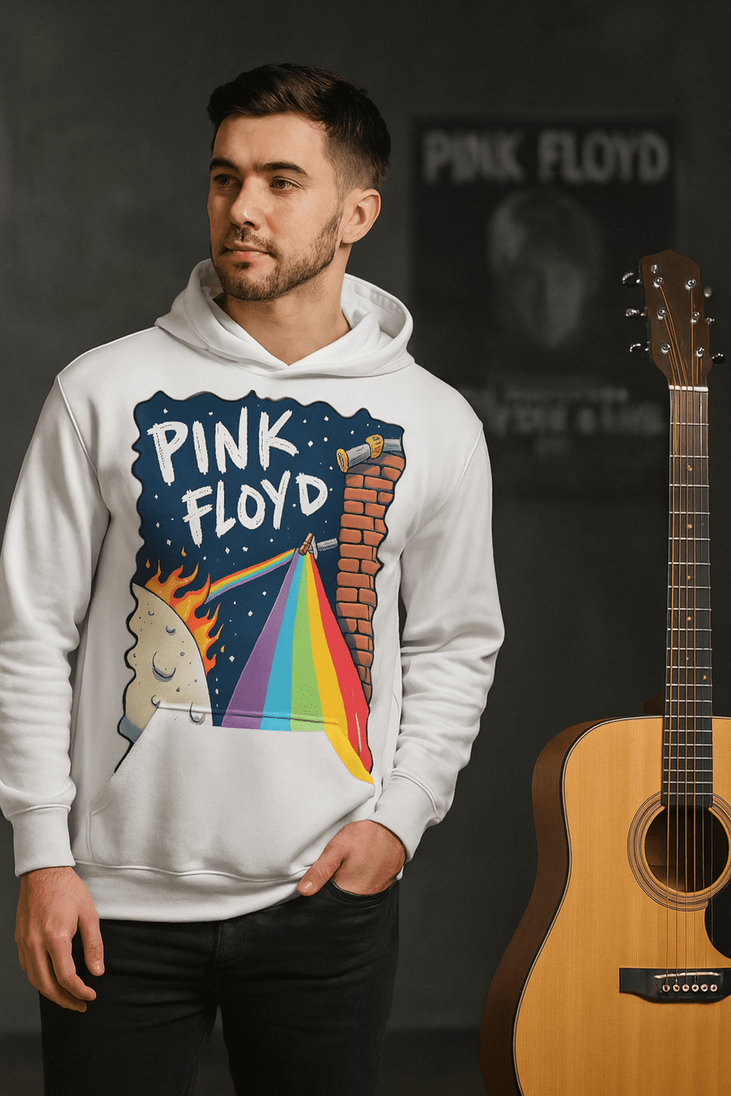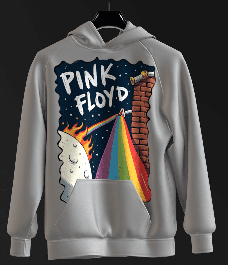 Still the classic six-color Floyd rainbow, but it now dramatically slams into a brick wall on the right side (a direct nod to another Pink Floyd masterpiece, The Wall). This merges two of the band’s biggest albums into one image.