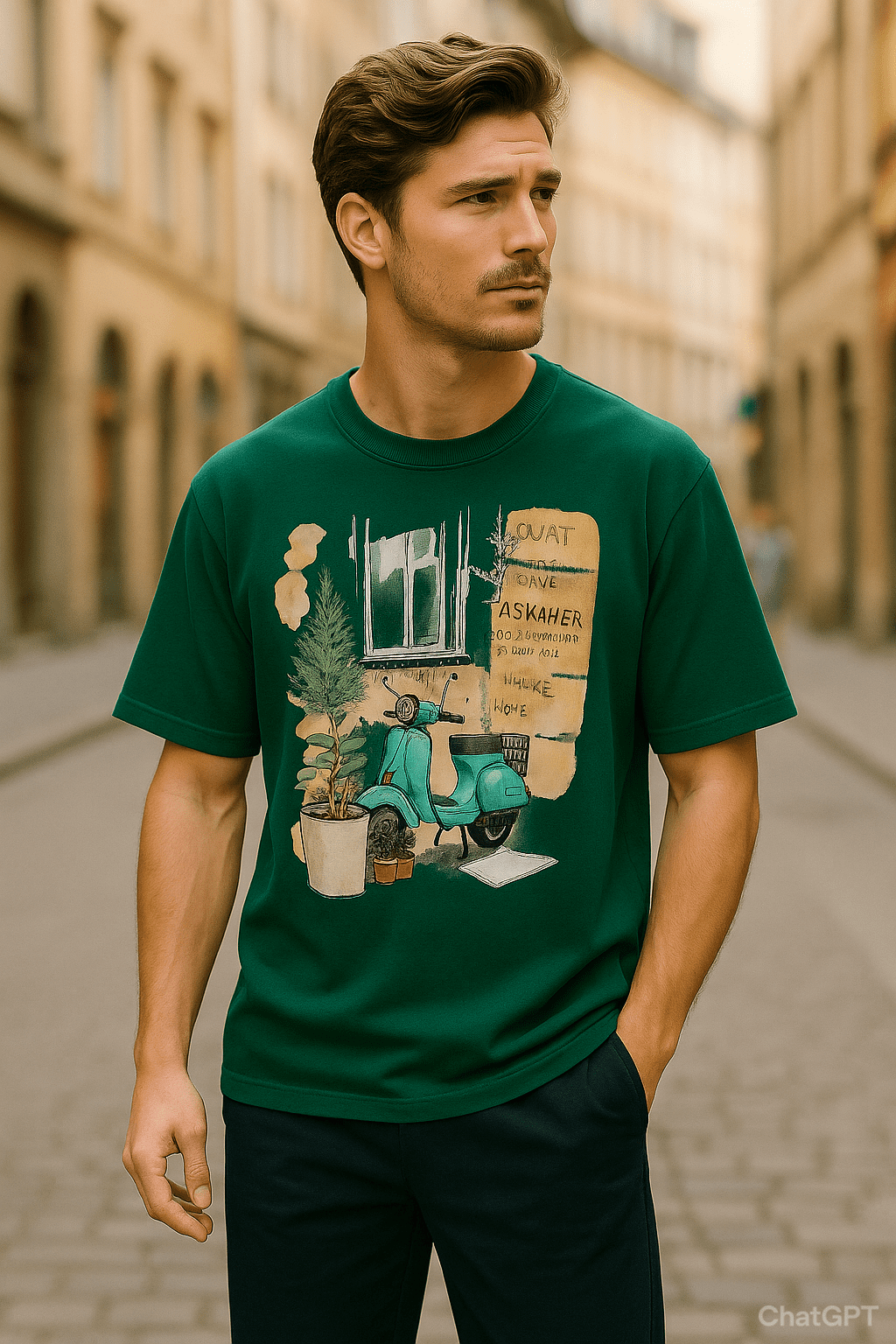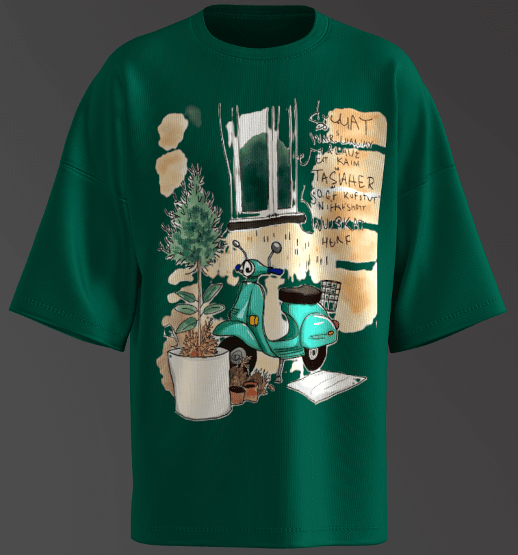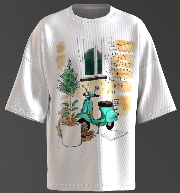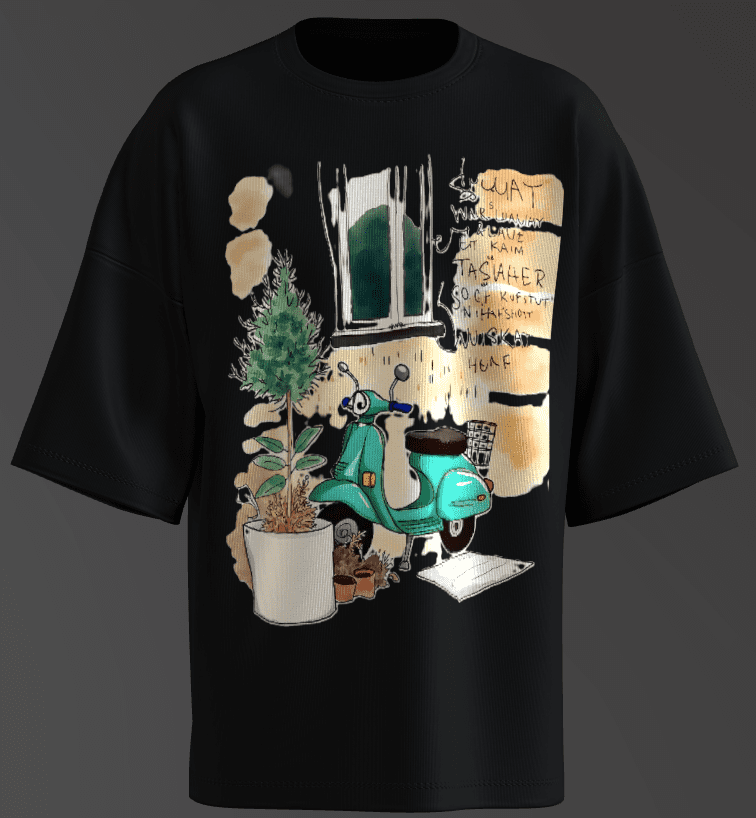 - The artwork draws from a blend of everyday life and artistic freedom. The scooter, a symbol of mobility and adventure, paired with the nurturing presence of the potted plant, suggests a balance between exploration and rootedness.