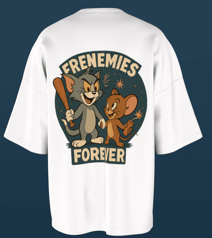 - The second image depicts Tom and Jerry together in a vintage poster style, with the text “FRENEMIES FOREVER” frames the scene, emphasizing their enduring rivalry and camaraderie.