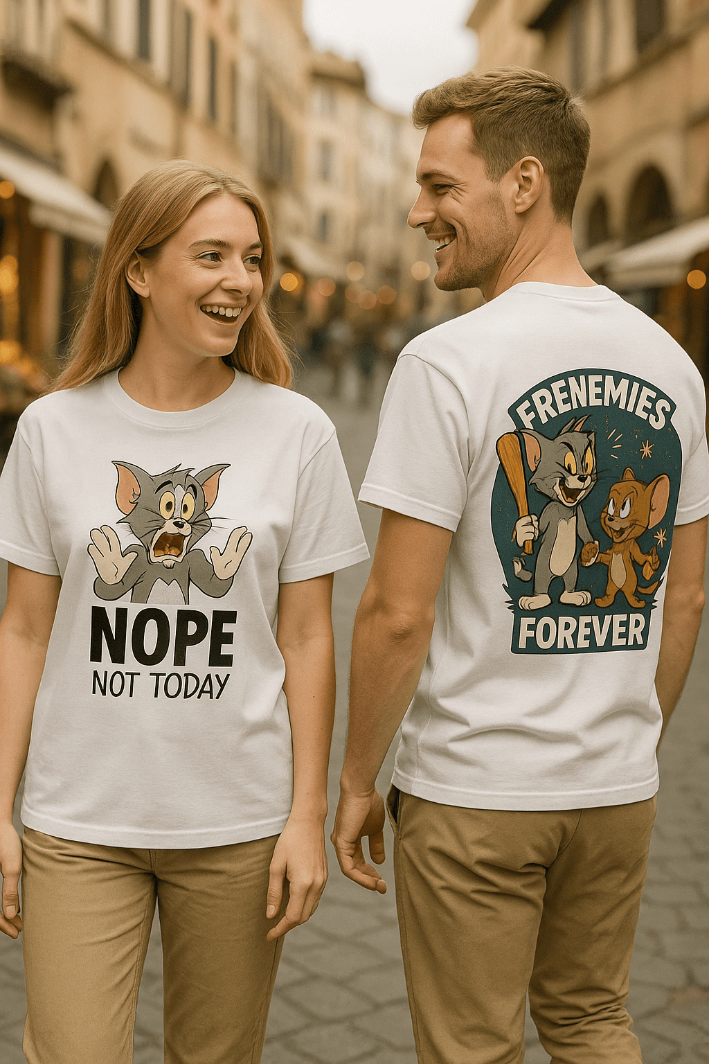 - The second image depicts Tom and Jerry together in a vintage poster style, with the text “FRENEMIES FOREVER” frames the scene, emphasizing their enduring rivalry and camaraderie.