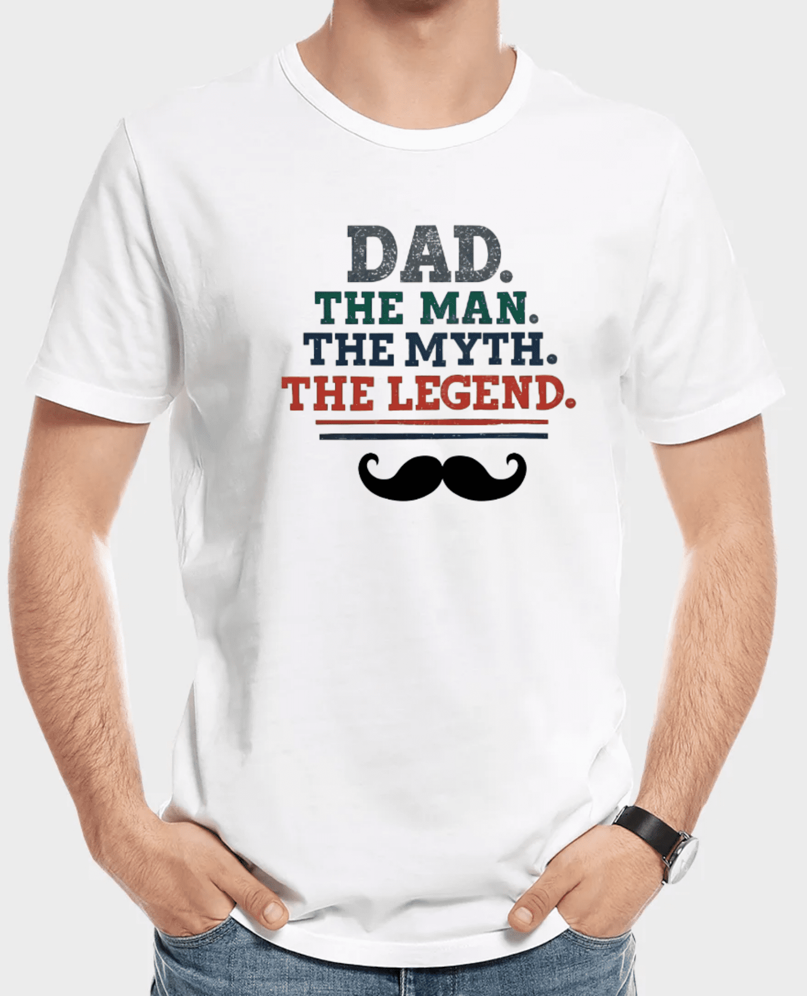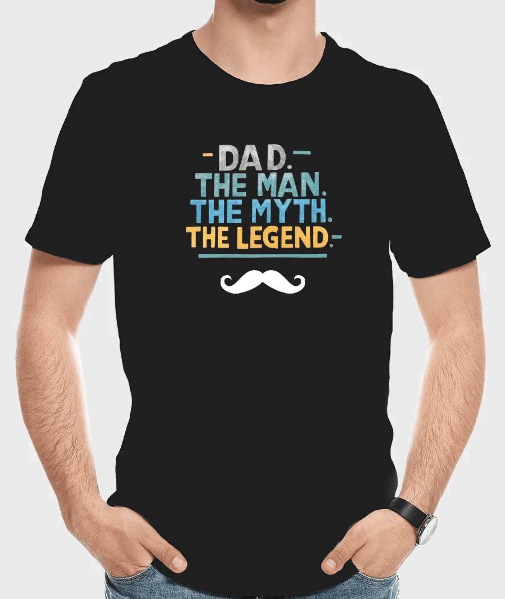 - The artwork on the T-shirt features a bold, celebratory design dedicated to fathers. It consists of the text “DAD. THE MAN. THE MYTH. THE LEGEND.” arranged in a stacked format